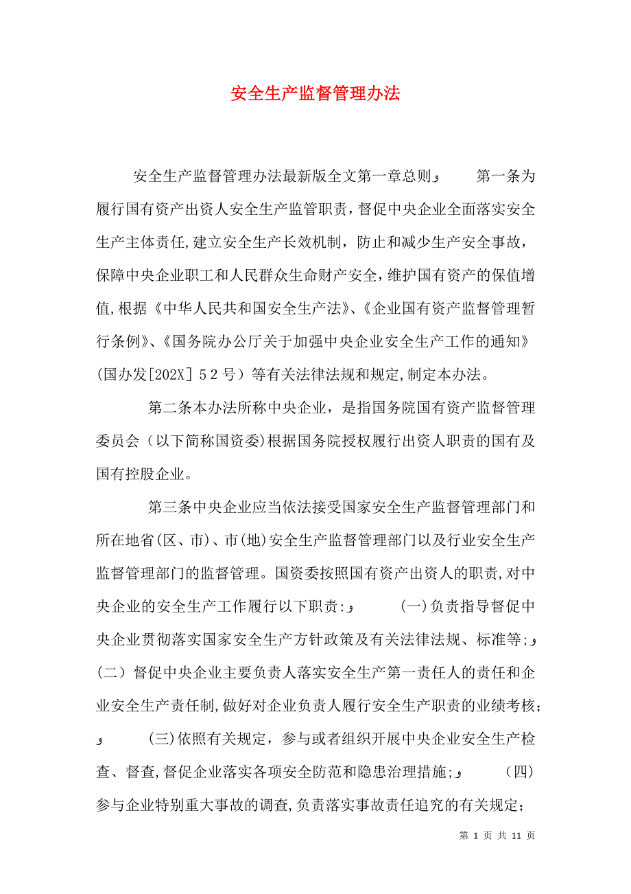 书山有路勤为径,学海无涯苦作舟安全生产监督管理办法 安全生产监督管理办法最新版全文第一章总则ﻭ 第一条为履行国有资产出资人安全生产监管职责,督促中央企业全面落实安全生产主体责任,建立安全生产长效机制,防止和减少生产安全事故,保障中央企业职工和人民群众生命财产安全,维护国有资产的保值增值,根据《中华人民共和国安全生产法》、《企业国有资产监督管理暂行条例》、《国务院办公厅关于加强中央企业安全生产工作的通知》(国办发[202X]52号)等有关法律法规和规定,制定本办法 第二条本办法所称中央企业,是指国务院国有资产监督管理委员会(以下简称国资委)根据国务院授权履行出资人职责的国有及国有控股企业 第三条中央企业应当依法接受国家安全生产监督管理部门和所在地省(区、市)、市(地)安全生产监督管理部门以及行业安全生产监督管理部门的监督管理国资委按照国有资产出资人的职责,对中央企业的安全生产工作履行以下职责:ﻭ (一)负责指导督促中央企业贯彻落实国家安全生产方针政策及有关法律法规、标准等;ﻭ (二)督促中央企业主要负责人落实安全生产第一责任人的责任和企业安全生产责任制,做好对企业负责人履行安全生产职责的业绩考核;ﻭ (三)依照有关规定,参与或者组织开展中央企业安全生产检查、督查,督促企业落实各项安全防范和隐患治理措施;ﻭ (四)参与企业特别重大事故的调查,负责落实事故责任追究的有关规定; (五)督促企业做好统筹规划,把安全生产纳入中长期发展规划,保障职工健康与安全,切实履行社会责任。