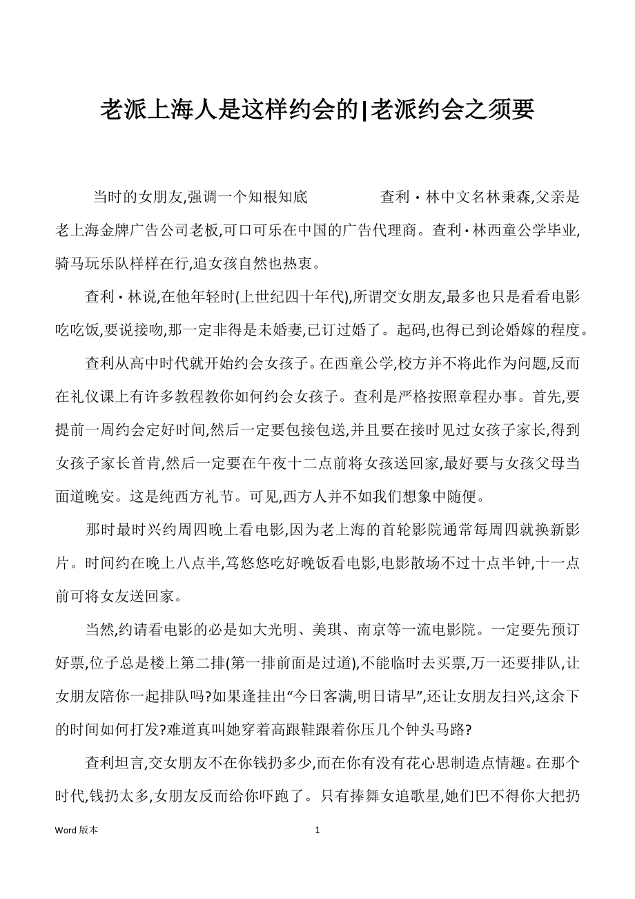 老派上海人是这样约会的|老派约会之须要 当时的女朋友,强调一个知根知底 查利・林中文名林秉森,父亲是老上海金牌广告公司老板,可口可乐在中国的广告代理商查利・林西童公学毕业,骑马玩乐队样样在行,追女孩自然也热衷 查利・林说,在他年轻时(上世纪四十年代),所谓交女朋友,最多也只是看看电影吃吃饭,要说接吻,那一定非得是未婚妻,已订过婚了起码,也得已到论婚嫁的程度 查利从高中时代就开始约会女孩子在西童公学,校方并不将此作为问题,反而在礼仪课上有许多教程教你如何约会女孩子查利是严格按照章程办事首先,要提前一周约会定好时间,然后一定要包接包送,并且要在接时见过女孩子家长,得到女孩子家长首肯,然后一定要在午夜十二点前将女孩送回家,最好要与女孩父母当面道晚安这是纯西方礼节可见,西方人并不如我们想象中随便 那时最时兴约周四晚上看电影,因为老上海的首轮影院通常每周四就换新影片时间约在晚上八点半,笃悠悠吃好晚饭看电影,电影散场不过十点半钟,十一点前可将女友送回家 当然,约请看电影的必是如大光明、美琪、南京等一流电影院一定要先预订好票,位子总是楼上第二排(第一排前面是过道),不能临时去买票,万一还要排队,让女朋友陪你一起排队吗?如果逢挂出“今日客满,明日请早”,还让女朋友扫兴,这余下的时间如何打发?难道真叫她穿着高跟鞋跟着你压几个钟头马路? 查利坦言,交女朋友不在你钱扔多少,而在你有没有花心思制造点情趣。