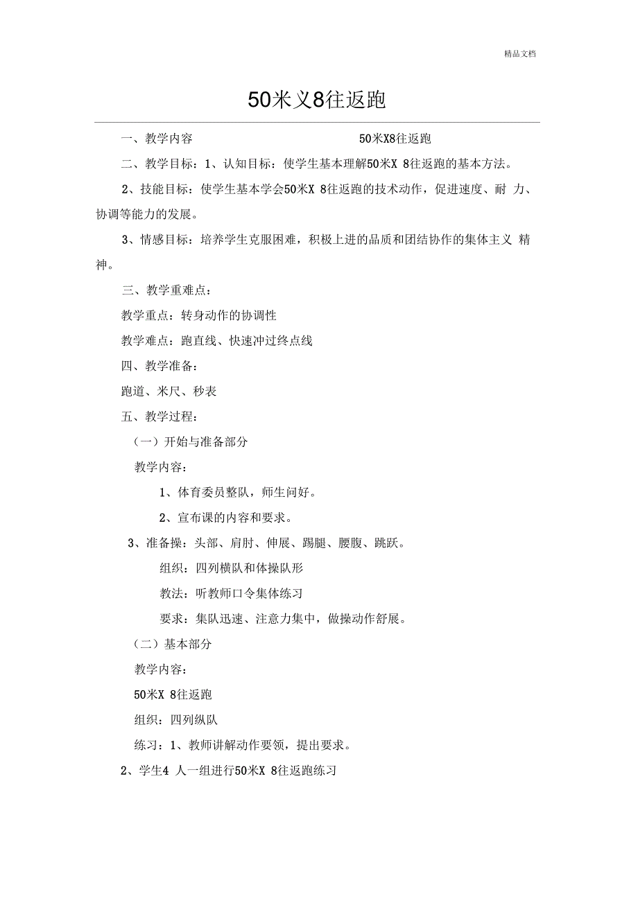 精品文档50米义8往返跑一、教学内容 50米X8往返跑二、教学目标:1、认知目标:使学生基本理解50米X 8往返跑的基本方法2、技能目标:使学生基本学会50米X 8往返跑的技术动作,促进速度、耐 力、协调等能力的发展3、情感目标:培养学生克服困难,积极上进的品质和团结协作的集体主义 精神三、教学重难点:教学重点:转身动作的协调性教学难点:跑直线、快速冲过终点线四、教学准备:跑道、米尺、秒表五、教学过程:(一)开始与准备部分教学内容:1、体育委员整队,师生问好2、宣布课的内容和要求3、准备操:头部、肩肘、伸展、踢腿、腰腹、跳跃组织:四列横队和体操队形教法:听教师口令集体练习要求:集队迅速、注意力集中,做操动作舒展二)基本部分教学内容:50米X 8往返跑组织:四列纵队练习:1、教师讲解动作要领,提出要求2、学生4 人一组进行50米X 8往返跑练习3、教师讲评示范后,学生再练习4、小组互评练习要求:认真练习、互帮互学,提高跑的质量(三)结束部但教学内容:1、放松操2、小结 。