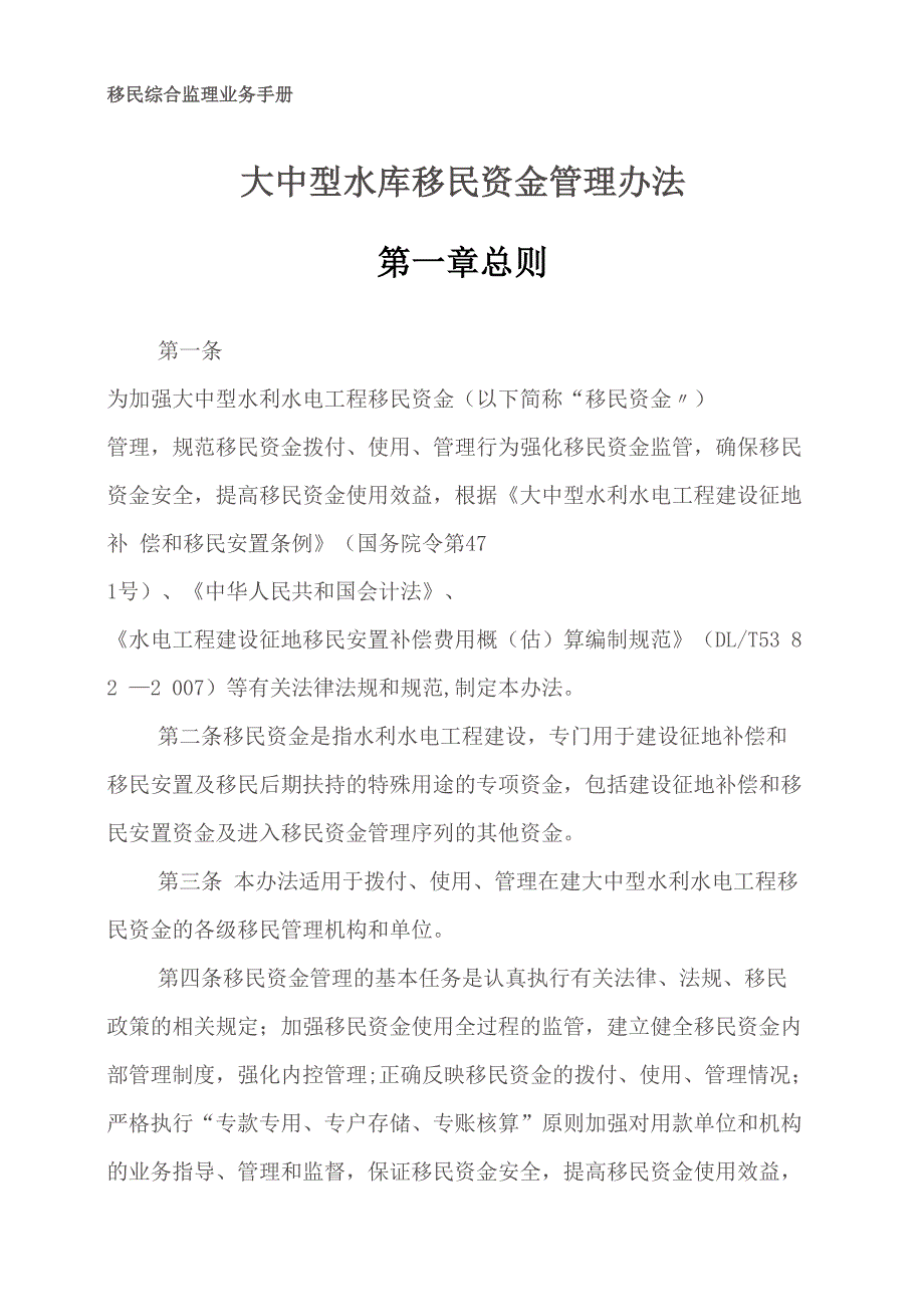 移民综合监理业务手册大中型水库移民资金管理办法第一章总则第一条 为加强大中型水利水电工程移民资金(以下简称“移民资金〃) 管理,规范移民资金拨付、使用、管理行为强化移民资金监管,确保移民 资金安全,提高移民资金使用效益,根据《大中型水利水电工程建设征地补 偿和移民安置条例》(国务院令第47 1号)、《中华人民共和国会计法》、 《水电工程建设征地移民安置补偿费用概(估)算编制规范》(DL/T53 8 2 —2 007)等有关法律法规和规范,制定本办法第二条移民资金是指水利水电工程建设,专门用于建设征地补偿和 移民安置及移民后期扶持的特殊用途的专项资金,包括建设征地补偿和移 民安置资金及进入移民资金管理序列的其他资金第三条 本办法适用于拨付、使用、管理在建大中型水利水电工程移 民资金的各级移民管理机构和单位第四条移民资金管理的基本任务是认真执行有关法律、法规、移民 政策的相关规定;加强移民资金使用全过程的监管,建立健全移民资金内 部管理制度,强化内控管理;正确反映移民资金的拨付、使用、管理情况; 严格执行“专款专用、专户存储、专账核算”原则加强对用款单位和机构 的业务指导、管理和监督,保证移民资金安全,提高移民资金使用效益,保 障移民的合法权益。