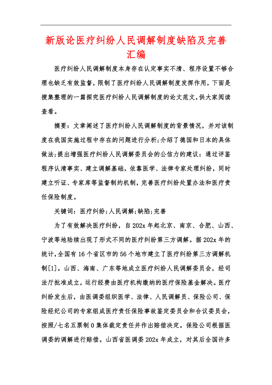 新版论医疗纠纷人民调解制度缺陷及完善汇编 医疗纠纷人民调解制度本身存在认定事实不清、程序设置不够合理也缺乏有效监督,限制了医疗纠纷人民调解制度发挥作用,下面是搜集整理的一篇探究医疗纠纷人民调解制度的论文范文,供大家阅读查看 摘要:文章阐述了医疗纠纷人民调解制度的背景情况,并对该制度在我国实施过程中存在的问题进行分析;介绍了德国和日本的具体做法;提出增强医疗纠纷人民调解委员会的公信力的建议:通过评鉴程序认清事实、建立调解基础,依靠医学、法律专家处理纠纷,同时建立听证、专家库等监督制约机制,完善医疗纠纷处置办法和医疗责任保险制度 关键词:医疗纠纷;人民调解;缺陷;完善 为了有效解决医疗纠纷,自202x年起北京、南京、合肥、山西、宁波等地陆续出现了形式不同的医疗纠纷第三方调解据202x年的统计,全国有16个省区市的56个地市建立了医疗纠纷第三方调解机制[1]山西、海南、广东等地成立医疗纠纷人民调解委员会,经司法厅批准成立,运行经费由医疗机构缴纳的医疗保险基金解决医疗纠纷发生后,由医调委组织医学、法律、人民调解员、保险公司、保险经纪公司的专家组成医疗责任保险事故鉴定委员会和合议委员会,按照/七名五票制0集体裁定责任并作出赔偿决定。