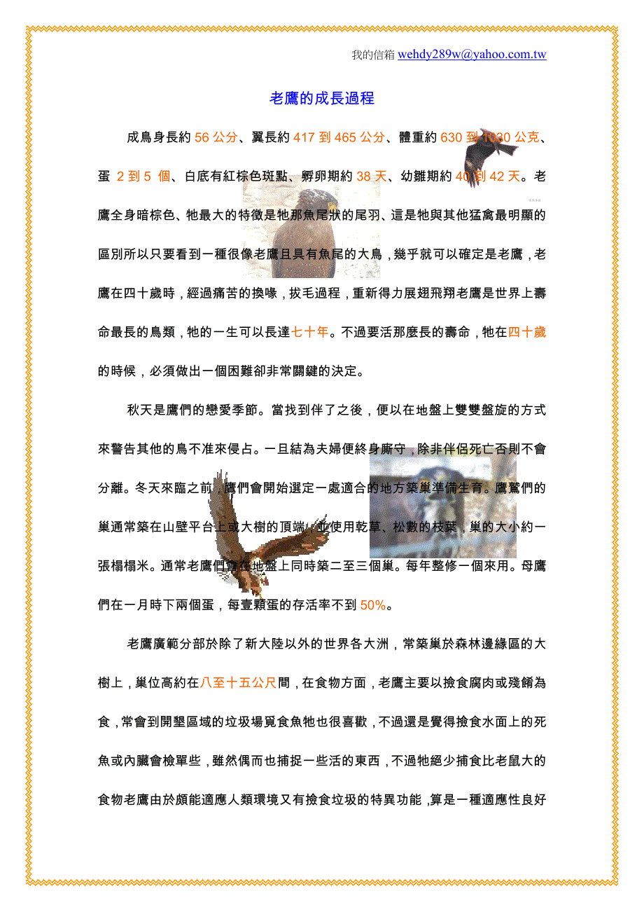我的信箱wehdy289w@.tw老鷹的成長過程成鳥身長約 56 公分、翼長約 417 到 465 公分、體重約 630 到 1030 公克、蛋 2 到 5 個、白底有紅棕色斑點、孵卵期約 38 天、幼雛期約 40 到 42 天老鷹全身暗棕色、牠最大的特徵是牠那魚尾狀的尾羽、這是牠與其他猛禽最明顯的區別所以只要看到一種很像老鷹且具有魚尾的大鳥,幾乎就可以確定是老鷹,老鷹在四十歲時,經過痛苦的換喙,拔毛過程,重新得力展翅飛翔老鷹是世界上壽命最長的鳥類,牠的一生可以長達七十年不過要活那麼長的壽命,牠在四十歲的時候,必須做出一個困難卻非常關鍵的決定秋天是鷹們的戀愛季節當找到伴了之後,便以在地盤上雙雙盤旋的方式來警告其他的鳥不准來侵占一旦結為夫婦便終身廝守,除非伴侶死亡否則不會分離冬天來臨之前,鷹們會開始選定一處適合的地方築巢準備生育鷹鷲們的巢通常築在山壁平台上或大樹的頂端,並使用乾草、松數的枝葉,巢的大小約一張榻榻米通常老鷹們會在地盤上同時築二至三個巢每年整修一個來用母鷹們在一月時下兩個蛋,每壹顆蛋的存活率不到 50%老鷹廣範分部於除了新大陸以外的世界各大洲,常築巢於森林邊緣區的大樹上,巢位高約在八至十五公尺間,在食物方面,老鷹主要以撿食腐肉或殘餚為食,常會到開墾區域的垃圾場覓食魚牠也很喜歡,不過還是覺得撿食水面上的死魚或內臟會檢單些,雖然偶而也捕捉一些活的東西,不過牠絕少捕食比老鼠大的食物老鷹由於頗能適應人類環境又有撿食垃圾的特異功能,算是一種適應性良好的猛禽,不過進年來因為覓食區的減少及殺蟲劑的氾濫使用,使老鷹已逐漸步上滅絕的危機。
