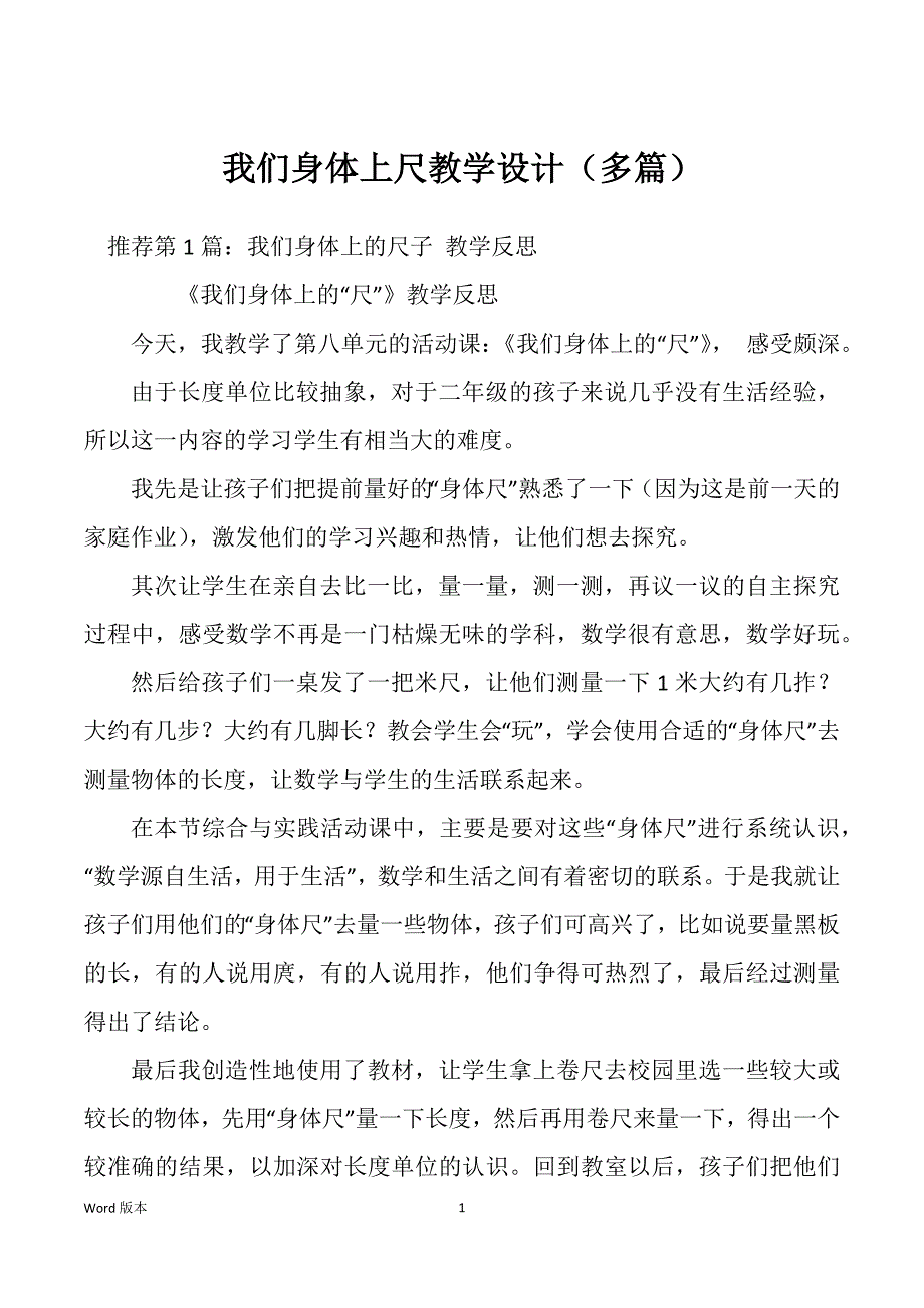 我们身体上尺教学设计(多篇)推荐第1篇:我们身体上的尺子 教学反思 《我们身体上的“尺”》教学反思 今天,我教学了第八单元的活动课:《我们身体上的“尺”》, 感受颇深 由于长度单位比较抽象,对于二年级的孩子来说几乎没有生活经验,所以这一内容的学习学生有相当大的难度 我先是让孩子们把提前量好的“身体尺”熟悉了一下(因为这是前一天的家庭作业),激发他们的学习兴趣和热情,让他们想去探究 其次让学生在亲自去比一比,量一量,测一测,再议一议的自主探究过程中,感受数学不再是一门枯燥无味的学科,数学很有意思,数学好玩 然后给孩子们一桌发了一把米尺,让他们测量一下1米大约有几拃?大约有几步?大约有几脚长?教会学生会“玩”,学会使用合适的“身体尺”去测量物体的长度,让数学与学生的生活联系起来 在本节综合与实践活动课中,主要是要对这些“身体尺”进行系统认识, “数学源自生活,用于生活”,数学和生活之间有着密切的联系于是我就让孩子们用他们的“身体尺”去量一些物体,孩子们可高兴了,比如说要量黑板的长,有的人说用庹,有的人说用拃,他们争得可热烈了,最后经过测量得出了结论。