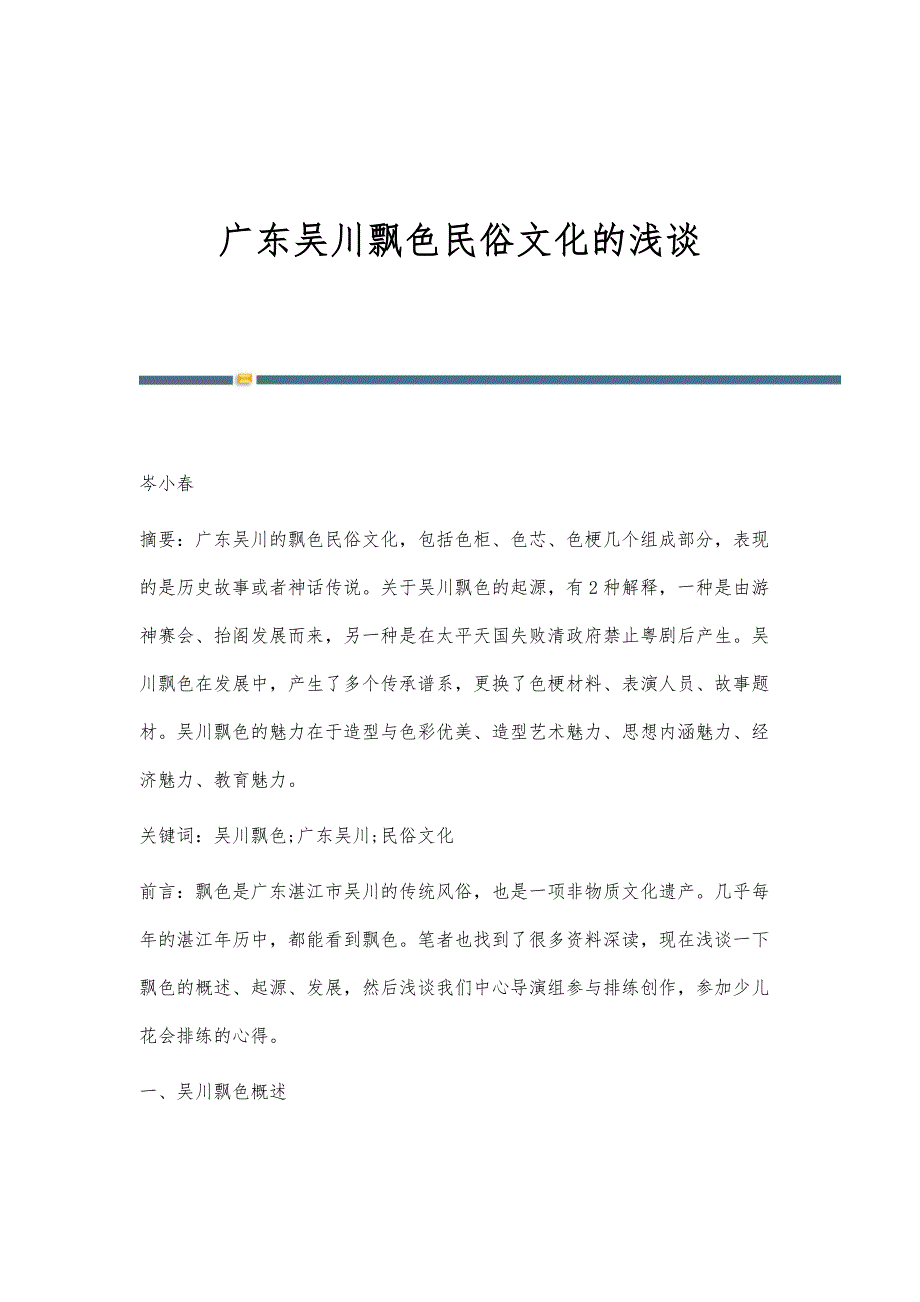 广东吴川飘色民俗文化的浅谈 岑小春摘要:广东吴川的飘色民俗文化,包括色柜、色芯、色梗几个组成部分,表现的是历史故事或者神话传说关于吴川飘色的起源,有2种解释,一种是由游神赛会、抬阁发展而来,另一种是在太平天国失败清政府禁止粤剧后产生吴川飘色在发展中,产生了多个传承谱系,更换了色梗材料、表演人员、故事题材吴川飘色的魅力在于造型与色彩优美、造型艺术魅力、思想内涵魅力、经济魅力、教育魅力关键词:吴川飘色;广东吴川;民俗文化前言:飘色是广东湛江市吴川的传统风俗,也是一项非物质文化遗产几乎每年的湛江年历中,都能看到飘色笔者也找到了很多资料深读,现在浅谈一下飘色的概述、起源、发展,然后浅谈我们中心导演组参与排练创作,参加少儿花会排练的心得一、吴川飘色概述《吴川文物县志》记载,飘色就是由几个人推一个“色柜”,其上装饰固定姿态的人物,人物依靠裹藏在衣物中的“色梗”支撑的民俗艺术活动飘色人物造型均为戏剧人物的艺术造型,表现历史故事或者神话传说[1]一)色柜飘色中人物造型的展台,叫作色柜色柜一般由坤甸木制成,规格大约为150cm×80cm×65cm,非常结实色柜左右两侧都有抽屉,里面装着飘色所用的相关道具、化妆品等器具;还穿着一条长木杠(色杠),用于抬着色柜巡游[2]。