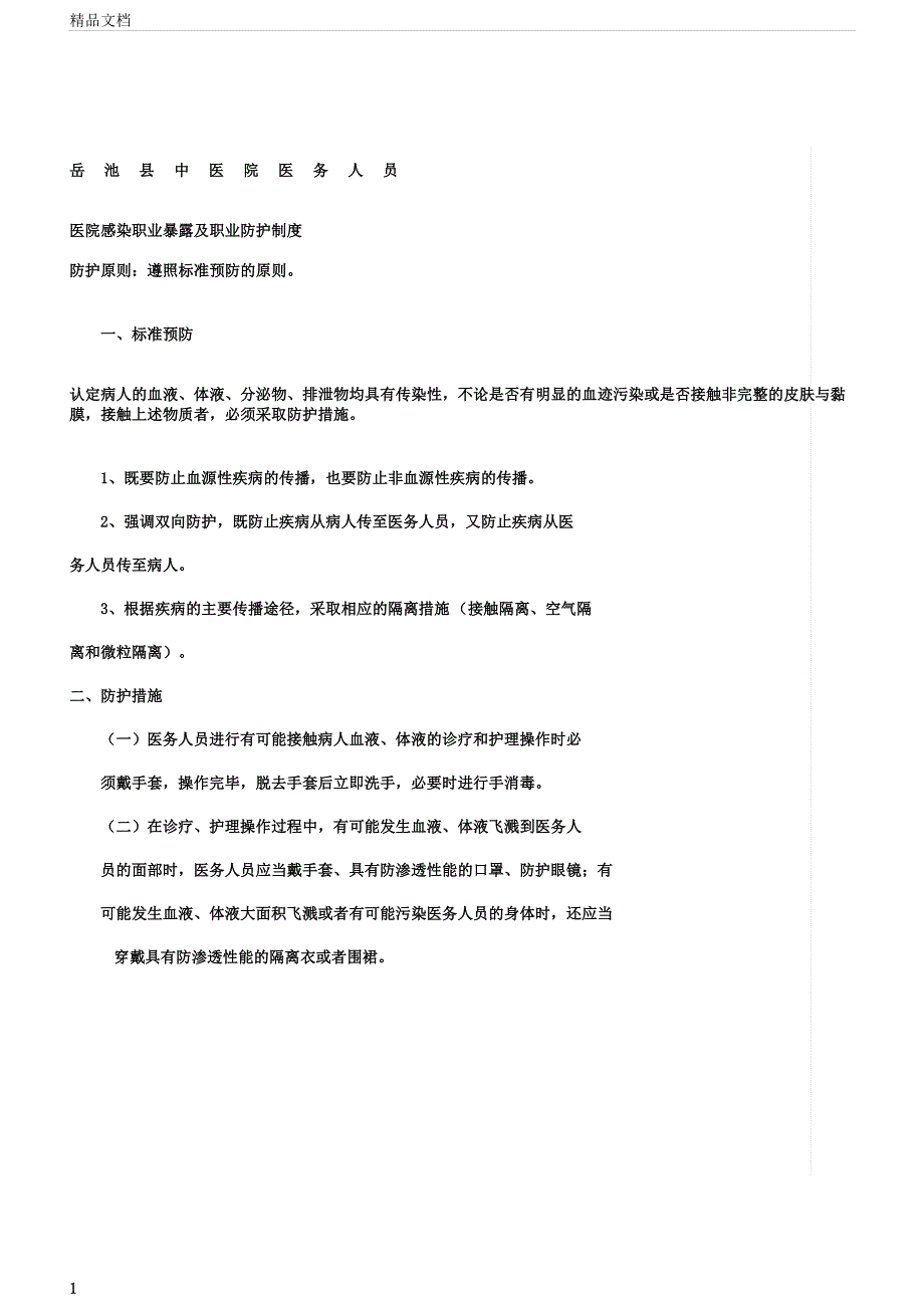 精品文档岳 池 县 中 医 院 医 务 人 员医院感染职业暴露及职业防护制度防护原则:遵照标准预防的原则一、标准预防认定病人的血液、体液、分泌物、排泄物均具有传染性,不论是否有明显的血迹污染或是否接触非完整的皮肤与黏膜,接触上述物质者,必须采取防护措施1、既要防止血源性疾病的传播,也要防止非血源性疾病的传播2、强调双向防护,既防止疾病从病人传至医务人员,又防止疾病从医务人员传至病人3、根据疾病的主要传播途径,采取相应的隔离措施 (接触隔离、空气隔离和微粒隔离)二、防护措施(一)医务人员进行有可能接触病人血液、体液的诊疗和护理操作时必须戴手套,操作完毕,脱去手套后立即洗手,必要时进行手消毒二)在诊疗、护理操作过程中,有可能发生血液、体液飞溅到医务人员的面部时,医务人员应当戴手套、具有防渗透性能的口罩、防护眼镜;有可能发生血液、体液大面积飞溅或者有可能污染医务人员的身体时,还应当穿戴具有防渗透性能的隔离衣或者围裙3(三)医务人员手部皮肤发生破损,在进行有可能接触病人血液、体液的诊疗和护理操作时必须戴双层手套四)医务人员在进行侵袭性诊疗、护理操作过程中,要保证充足的光线,并特别注意防止被针头、缝合针、刀片等锐器刺伤或者划伤。