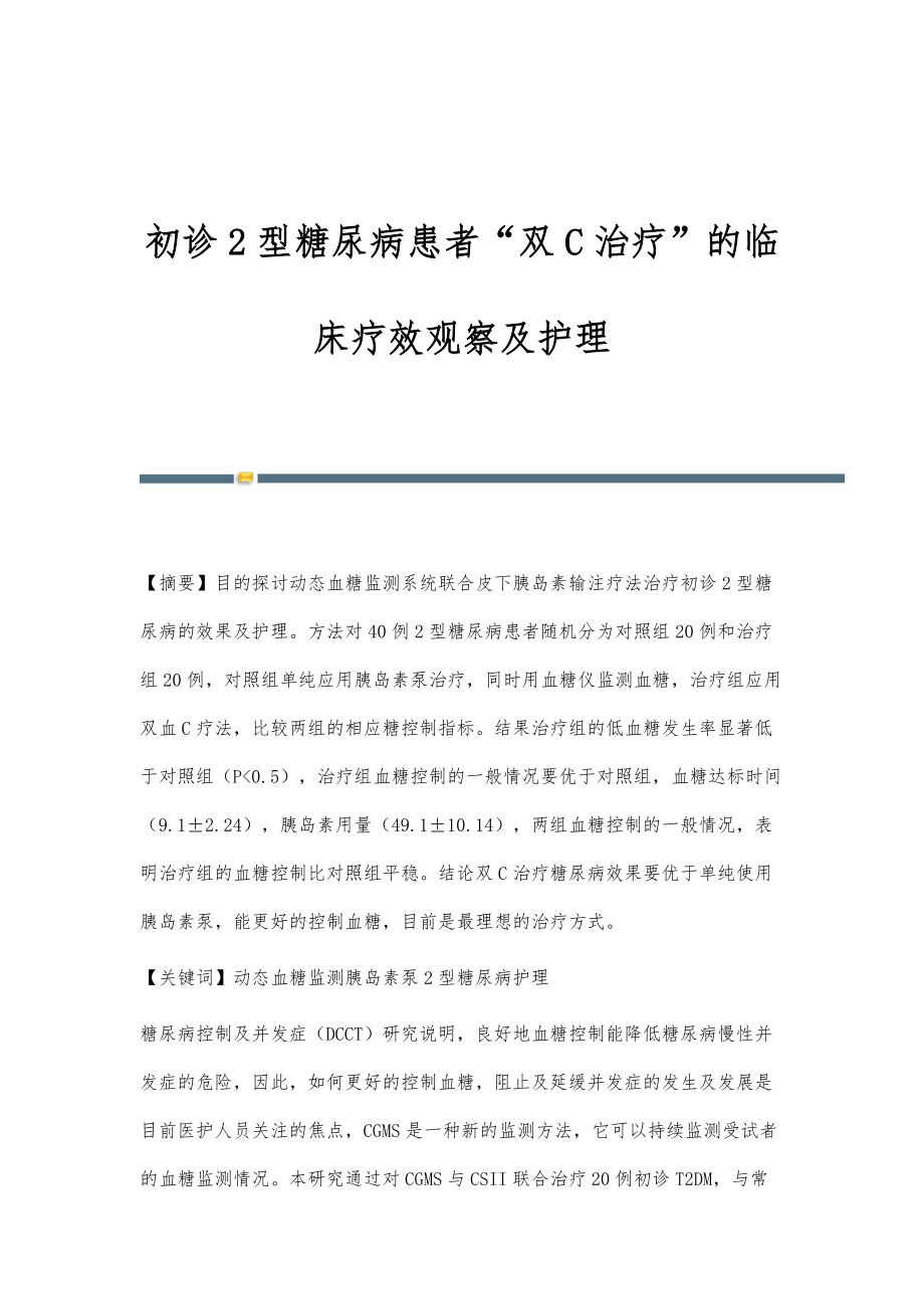 初诊2型糖尿病患者“双C治疗”的临床疗效观察及护理 【摘要】目的探讨动态血糖监测系统联合皮下胰岛素输注疗法治疗初诊2型糖尿病的效果及护理方法对40例2型糖尿病患者随机分为对照组20例和治疗组20例,对照组单纯应用胰岛素泵治疗,同时用血糖仪监测血糖,治疗组应用双血C疗法,比较两组的相应糖控制指标结果治疗组的低血糖发生率显著低于对照组(P<0.5),治疗组血糖控制的一般情况要优于对照组,血糖达标时间(9.1±2.24),胰岛素用量(49.1±10.14),两组血糖控制的一般情况,表明治疗组的血糖控制比对照组平稳结论双C治疗糖尿病效果要优于单纯使用胰岛素泵,能更好的控制血糖,目前是最理想的治疗方式关键词】动态血糖监测胰岛素泵2型糖尿病护理糖尿病控制及并发症(DCCT)研究说明,良好地血糖控制能降低糖尿病慢性并发症的危险,因此,如何更好的控制血糖,阻止及延缓并发症的发生及发展是目前医护人员关注的焦点,CGMS是一种新的监测方法,它可以持续监测受试者的血糖监测情况本研究通过对CGMS与CSII联合治疗20例初诊T2DM,与常规监测手指血糖配合胰岛素泵强化治疗对比,探讨评价CGMS联合胰岛素泵强化治疗初诊T2DM患者的临床意义。