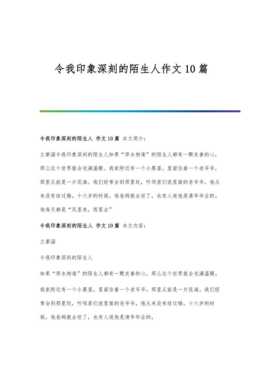 令我印象深刻的陌生人作文10篇 令我印象深刻的陌生人 作文10篇 本文简介:兰紫涵令我印象深刻的陌生人如果“萍水相逢”的陌生人都有一颗友善的心,那么这个世界就会充满温暖我家附近有一个小黑屋,里面住着一个老爷爷,那里从前是一片花海我们经常会到那里玩,听邻居们说里面的老爷爷,他从来没有结过婚十六岁的时候,他爸妈就去世了,也有人说他是清华毕业的他每天都是“风里来,雨里去”令我印象深刻的陌生人 作文10篇 本文内容:兰紫涵令我印象深刻的陌生人如果“萍水相逢”的陌生人都有一颗友善的心,那么这个世界就会充满温暖我家附近有一个小黑屋,里面住着一个老爷爷,那里从前是一片花海我们经常会到那里玩,听邻居们说里面的老爷爷,他从来没有结过婚十六岁的时候,他爸妈就去世了,也有人说他是清华毕业的他每天都是“风里来,雨里去”,很多人都叫他疯子,他每天都穿得非常整洁我每次见到他,他嘴里都会嘟哝着什么,听不清楚他也“博览群书”,在他的屋子门口经常会看到一堆废旧的书籍傍晚时分,他总会捧着一本书在那儿读得津津有味连我这个不喜欢读书的人都被他感染了他也非常有爱心他的家整理得非常干净,有时他会叫那些孩子们来自己家做客,并拿出自己珍藏的零食送给孩子。