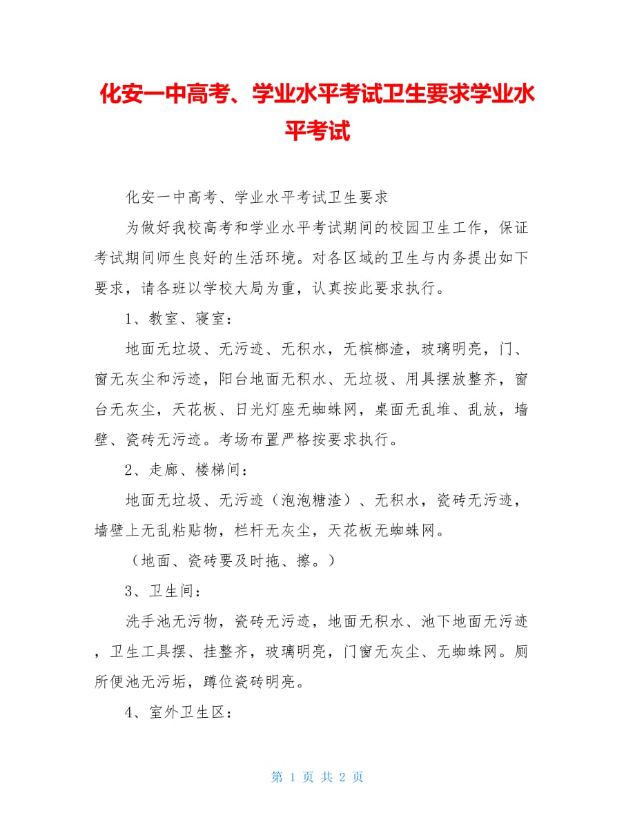 化安一中高考、学业水平考试卫生要求学业水平考试化安一中高考、学业水平考试卫生要求为做好我校高考和学业水平考试期间的校园卫生工作,保证考试期间师生良好的生活环境对各区域的卫生与内务提出如下要求,请各班以学校大局为重,认真按此要求执行1、教室、寝室:地面无垃圾、无污迹、无积水,无槟榔渣,玻璃明亮,门、窗无灰尘和污迹,阳台地面无积水、无垃圾、用具摆放整齐,窗台无灰尘,天花板、日光灯座无蜘蛛网,桌面无乱堆、乱放,墙壁、瓷砖无污迹考场布置严格按要求执行2、走廊、楼梯间:地面无垃圾、无污迹(泡泡糖渣)、无积水,瓷砖无污迹,墙壁上无乱粘贴物,栏杆无灰尘,天花板无蜘蛛网地面、瓷砖要及时拖、擦3、卫生间:洗手池无污物,瓷砖无污迹,地面无积水、池下地面无污迹,卫生工具摆、挂整齐,玻璃明亮,门窗无灰尘、无蜘蛛网厕所便池无污垢,蹲位瓷砖明亮4、室外卫生区:地面无垃圾、无污迹、无积水,瓷砖无污迹,墙壁(门柱)上无乱粘贴物,所有车辆停放规定地方5、垃圾桶:保持外壁清洁,垃圾及时倒,倒完垃圾后清洗垃圾桶内壁6、考场布置:严格按高考考场要求摆放桌、凳,清理板报各年级组织大扫除后,由年级组组织进行评比,对卫生不合格的班级进行整改,月假离校前由学生处组织进行验收。
