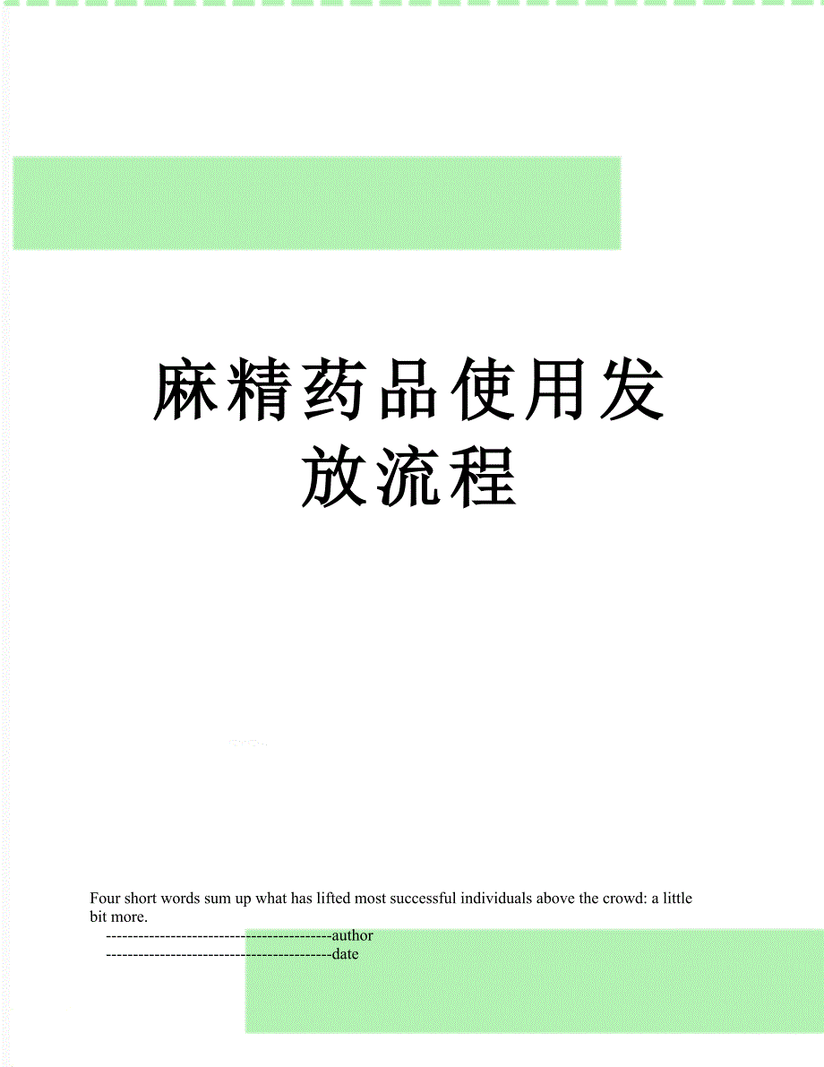 Four short words sum up what has lifted most successful individuals above the crowd: a little bit more.------------------------------------------author------------------------------------------date麻精药品使用发放流程麻精药品使用发放流程麻精药品使用、发放流程工作人员持医师开具的规范的麻醉药品专用处方到中心药房领取病房根据实际使用情况提交书面申请,报药学部和院医务处审批同意,建立病房基数经麻精药品培训合格医师开具麻精药品专用处方门急诊药房基数建立,经药学部同意后持基数表至药库麻精药品专柜领取药库麻精药品专柜门诊药房基数建立,经药学部同意后持基数表至药库麻精药品专柜领取各病区向中心药房传送患者用药信息病房人员持基数表至药房由药房负责人确认后发药并记录麻精药品放入病区麻精药品专柜,由专人负责,医师开具专用处方取药,并专册登记经麻精药品培训合格药师严格按规定审核处方药师按规定审核领药单及处方,无误后回收注射剂空安瓿。