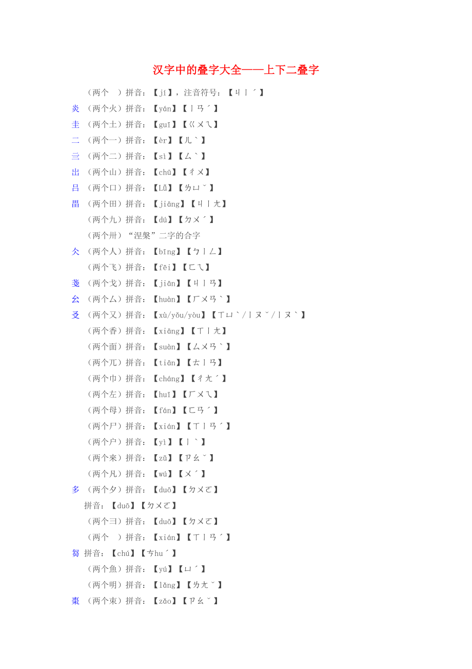 汉字中的叠字大全——上下二叠字(两个)拼音:【j】,注音符号:【ㄐㄧˊ】炎(两个火)拼音:【yn】【ㄧㄢˊ】圭(两个土)拼音:【guī】【ㄍㄨㄟ】二(两个一)拼音:【r】【ㄦˋ】亖(两个二)拼音:【s】【ㄙˋ】岀(两个山)拼音:【chū】【ㄔㄨ】吕(两个口)拼音:【Lǚ】【ㄌㄩˇ】畕(两个田)拼音:【jiāng】【ㄐㄧㄤ】(两个九)拼音:【d】【ㄉㄨˊ】(两个卅)“涅槃”二字的合字仌(两个人)拼音:【bīng】【ㄅㄧㄥ】(两个飞)拼音:【fēi】【ㄈㄟ】戔(两个戈)拼音:【jiān】【ㄐㄧㄢ】㕕(两个厶)拼音:【hun】【ㄏㄨㄢˋ】㕛(两个又)拼音:【x/yǒu/yu】【ㄒㄩˋ/ㄧㄡˇ/ㄧㄡˋ】(两个香)拼音:【xiāng】【ㄒㄧㄤ】(两个面)拼音:【sun】【ㄙㄨㄢˋ】(两个兀)拼音:【tiān】【ㄊㄧㄢ】(两个巾)拼音:【chng】【ㄔㄤˊ】(两个左)拼音:【huī】【ㄏㄨㄟ】(两个母)拼音:【fn】【ㄈㄢˊ】(两个尸)拼音:【xin】【ㄒㄧㄢˊ】(两个户)拼音:【y】【ㄧˋ】(两个來)拼音:【zǔ】【ㄗㄠˇ】(两个凡)拼音:【w】【ㄨˊ】多(两个夕)拼音:【duō】【ㄉㄨㄛ】拼音:【duō】【ㄉㄨㄛ】(两个彐)拼音:【duō】【ㄉㄨㄛ】(两个)拼音:【xin】【ㄒㄧㄢˊ】芻拼音:【ch】【ㄘhuˊ】(两个魚)拼音:【y】【ㄩˊ】(两个明)拼音:【lǎng】【ㄌㄤˇ】棗(两个朿)拼音:【zǎo】【ㄗㄠˇ】爻(两个乂)拼音:【yǎo】【ㄧㄠˊ】。
