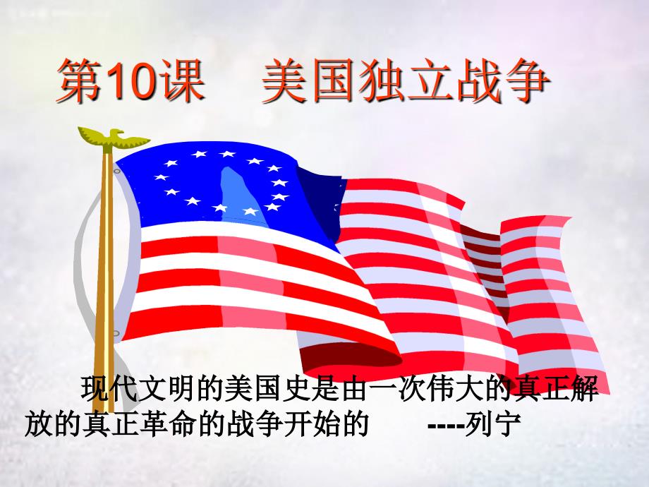 第10课 美国独立战争,现代文明的美国史是由一次伟大的真正解放的真正革命的战争开始的 ----列宁,一、根本原因: 阻碍 的发展 二、领导阶级: 领导人: 三、经过: 1.爆发: 2.建军: 年, 会议, 军队: ,总司令: 3.建国: 4.转折: 5.胜利:,北美资本主义,资产阶级,华盛顿,1775年,来克星顿枪声,1776.7.4,《独立宣言》,1777年,萨拉托加大捷,1783年,英国承认美国独立,英国的殖民统治,1775—1783(八年抗英),五、性质和意义: 1.性质(双重性): 2.意义:,,为什么这么说 ?,(1).最大意义:赢得了 ; (2).有利于 ; (3).推动了 既是民族解放战争,也是资产阶级革命 国家独立,资本主义发展,欧洲和拉美革命,—民族解放战争,—资产阶级革命,六、美国独立战争启示,国家独立是强大的前提七、《 1787年宪法》,1.联邦政府组成: 2.特点: 3.政体:,(1)国会: (2)总统: (3)最高法院:,三权分立,立法权,行政权,司法权,总统共和制,“战争时期最著名的将军,和平时期最杰出的领袖,同胞心目中最伟大的人物。