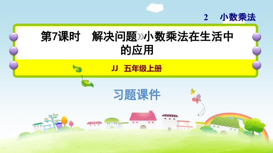第7课时 解决问题 小数乘法在生活中的应用,2 小数乘法,JJ 五年级上册,1,2,3,4,5,6,提示:点击 进入习题,,知识点 1,购物时的“舍分”,1.妈妈买了一个重4.2千克的西瓜后又买了0.4千克的糖,一共花了多少钱?妈妈付给售货员20元,应找回多少钱?,4.2×1.5+24.8×0.4=16.22(元)≈16.2(元) 20-16.2=3.8(元),,知识点 2,购物时的“凑整”,2.李阿姨买了1.6千克的鸡蛋,应付多少钱?为了不用找零,把买鸡蛋的钱凑成整元数,货主要再给李阿姨多少千克鸡蛋较合适?,2.6.5×1.6=10.4(元) 11-10.4=0.6(元) 货主要再给李阿姨0.1千克鸡蛋较合适知识点 3,生活中的“估算”,3.爷爷菜地里今年收获了50个冬瓜,冬瓜的大小不等,质量一般是3.5千克~4.5千克如果每千克冬瓜的售价是0.8元,这些冬瓜大约能卖多少钱?,(3.5+4.5)÷2=4(千克) 0.8×4×50=160(元),,易错辨析,4.小明家上个月用电79.8千瓦时,每千瓦时的价格是0.58元,这个月小明家的电费大约是多少元? 解:79.8×0.58≈80×1=80(元) 上面的估算合适吗?若不合适,请改正。
