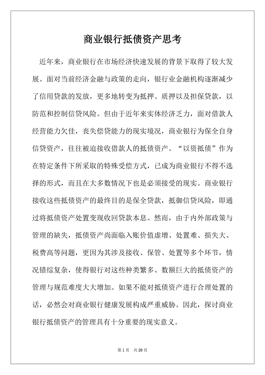 商业银行抵债资产思考 近年来,商业银行在市场经济快速发展的背景下取得了较大发展面对当前经济金融与政策的走向,银行业金融机构逐渐减少了信用贷款的发放,更多地转变为抵押、质押以及担保贷款,以防范和控制信贷风险但由于近年来实体经济乏力,面对借款人经营能力欠佳,丧失偿贷能力的现实境况,商业银行为保全自身信贷资产,往往被迫接收借款人的抵债资产以资抵债”作为在特定条件下所采取的特殊受偿方式,已成为商业银行不得不选择的形式,而且在大多数情况下也是必须接受的现实商业银行接收这些抵债资产的最终目的是保全贷款,抵御信贷风险,即通过将抵债资产处置变现收回贷款本息然而,由于内外部政策与管理的缺失,抵债资产尚面临入账价值虚增、处置难、损失大、税费高等问题,更因为其涉及接收、保管、处置等多个环节,情况错综复杂,使得银行对这些种类繁多、数额巨大的抵债资产的管理与规范难度大大增加如果不能对抵债资产进行合理处置的话,必然会对商业银行健康发展构成严重威胁因此,探讨商业银行抵债资产的管理具有十分重要的现实意义 一、抵债资产基本认识 (一)抵债资产的内涵所谓抵债资产,在我国一般被理解为“金融机构依法行使债权或担保物权,而受偿于债务人、担保人或第三人的实物资产或财产权利”。