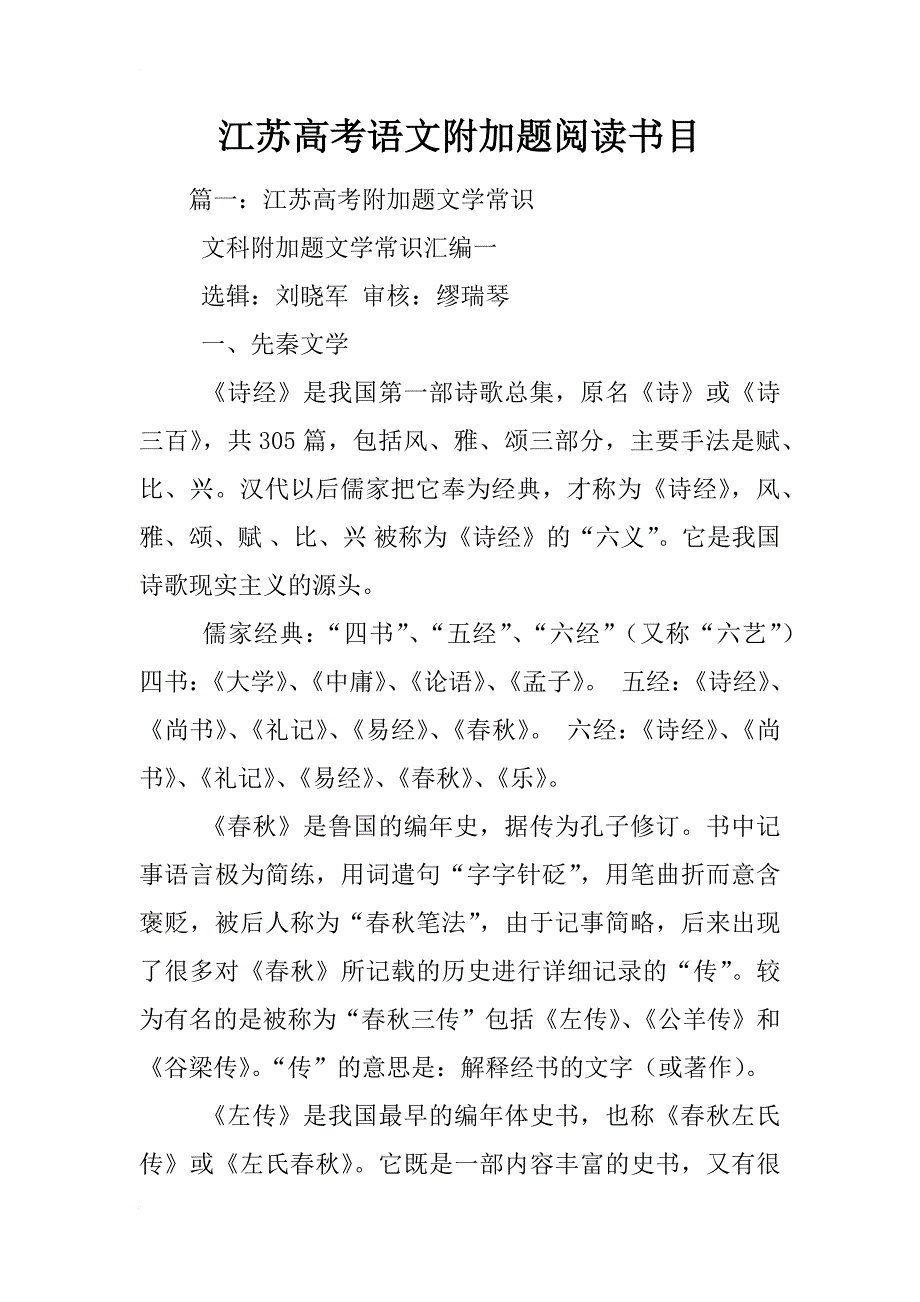 江苏高考语文附加题阅读书目江苏高考语文附加题阅读书目篇一:江苏高考附加题文学常识文科附加题文学常识汇编一 选辑:刘晓军 审核:缪瑞琴 一、先秦文学 《诗经》是我国第一部诗歌总集,原名《诗》或《诗三百》 ,共 305 篇,包括风、雅、颂三部分,主要手法是赋、比、兴汉代以后儒家把它奉为经典,才称为《诗经》 ,风、雅、颂、赋 、比、兴 被称为《诗经》的“六义” 它是我国诗歌现实主义的源头 儒家经典:“四书” 、 “五经” 、 “六经” (又称“六艺” )四书:《大学》 、 《中庸》 、 《论语》 、 《孟子》 五经:《诗经》 、 《尚书》 、 《礼记》 、 《易经》 、 《春秋》 六经:《诗经》 、《尚书》 、 《礼记》 、 《易经》 、 《春秋》 、 《乐》 《春秋》是鲁国的编年史,据传为孔子修订书中记事语言极为简练,用词遣句“字字针砭” ,用笔曲折而意含褒贬,被后人称为“春秋笔法” ,由于记事简略,后来出现了很多对《春秋》所记载的历史进行详细记录的“传” 较为有名的是被称为“春秋三传”包括《左传》 、 《公羊传》和《谷梁传》 “传”的意思是:解释经书的文字(或著作) 《左传》是我国最早的编年体史书,也称《春秋左氏传》或《左氏春秋》 。