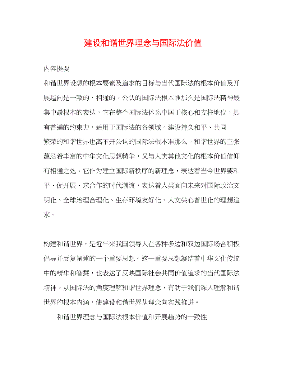 建设和谐世界理念与国际法价值内容提要 和谐世界设想的根本要素及追求的目标与当代国际法的根本价值及开展趋向是一致的、相通的公认的国际法根本准那么是国际法精神最集中最根本的表达,它在整个国际法体系中居于核心和支柱地位,具有普遍的约束力,适用于国际法的各领域建设持久和平、共同 繁荣的和谐世界也离不开公认的国际法根本准那么和谐世界的主张蕴涵着丰富的中华文化思想精华,又与人类其他文化的根本价值信仰有相通之处它作为建立国际新秩序的新理念,表达着当今世界要和平、促开展、求合作的时代潮流,表达着人类面向未来对国际政治文明化、全球治理合理化、生存环境友好化、人文关心普世化的理想追求 构建和谐世界,是近年来我国领导人在各种多边和双边国际场合积极倡导并反复阐述的一个重要思想这一重要思想凝结着中华文化传统中的精华和智慧,也表达了反映国际社会共同价值追求的当代国际法精神从国际法的角度理解和谐世界理念,有助于我们深入理解和谐世界的根本内涵,使建设和谐世界从理念向实践推进 和谐世界理念与国际法根本价值和开展趋势的一致性 国际法是调整国家间关系以及其他跨国关系的法律长期以来,尽管人们对国际法的法律地位和性质一直存在不同的看法,但它在国际社会中的作用日益突出,越来越受到各国的重视。