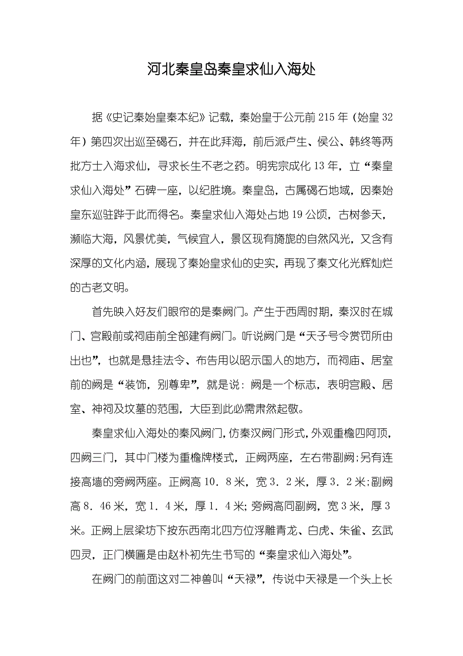 河北秦皇岛秦皇求仙入海处 据《史记秦始皇秦本纪》记载,秦始皇于公元前215年(始皇32年)第四次出巡至碣石,并在此拜海,前后派卢生、侯公、韩终等两批方士入海求仙,寻求长生不老之药明宪宗成化13年,立“秦皇求仙入海处”石碑一座,以纪胜境秦皇岛,古属碣石地域,因秦始皇东巡驻跸于此而得名秦皇求仙入海处占地19公顷,古树参天,濒临大海,风景优美,气候宜人,景区现有旖旎的自然风光,又含有深厚的文化内涵,展现了秦始皇求仙的史实,再现了秦文化光辉灿烂的古老文明 首先映入好友们眼帘的是秦阙门产生于西周时期,秦汉时在城门、宫殿前或祠庙前全部建有阙门听说阙门是“天子号令赏罚所由出也”,也就是悬挂法令、布告用以昭示国人的地方,而祠庙、居室前的阙是“装饰,别尊卑”,就是说:阙是一个标志,表明宫殿、居室、神祠及坟墓的范围,大臣到此必需肃然起敬 秦皇求仙入海处的秦风阙门,仿秦汉阙门形式,外观重檐四阿顶,四阙三门,其中门楼为重檐牌楼式,正阙两座,左右带副阙;另有连接高墙的旁阙两座正阙高10.8米,宽3.2米,厚3.2米;副阙高8.46米,宽1.4米,厚1.4米;旁阙高同副阙,宽3米,厚3米正阙上层梁坊下按东西南北四方位浮雕青龙、白虎、朱雀、玄武四灵,正门横匾是由赵朴初先生书写的“秦皇求仙入海处”。