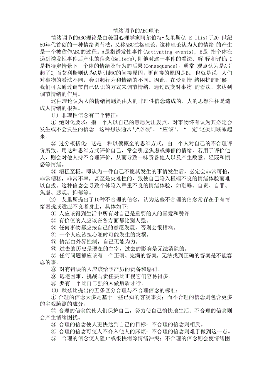 情绪调节的ABC理论情绪调节的ABC理论是由美国心理学家阿尔伯特•艾里斯(A・E llis)于20 世纪50年代首创的一种情绪调节法,又称ABC性格理论这种理论认为人的情绪 的产生是一个被称作ABC的过程A是指诱发性事件(Activating events), B是 指个体在遇到诱发性事件后产生的信念(Beliefs),即他对这一事件的看法、解 释和评价;C是指特定情景下,个体的情绪及行为的后果(Consequence)通常 观点认为是A引起了C,而艾利斯则认为A是引起C的间接原因,更直接的原因是B 也就是说,人们对事物的看法不同,会引起行为和情绪的不同因此,在受到情 绪困扰的时候,我们可以通过调节自己认识的方式来调节情绪,通过改变对事物 的看法,来达到调节情绪的作用这种理论认为人的情绪问题是由人的非理性信念造成的,人的思想往往是造 成人情绪的根源1) 非理性信念有三个特征:① 绝对化要求:指一个人以自己的意愿为出发点,对事物怀有认为其必定会 发生或不会发生的信念这种想法通常与“必须” “应该”、 “一定”这类词联系起 来② 过分概括化:这是一种以偏概全的思维方式,由一个人对自己的不合理评 价所致。