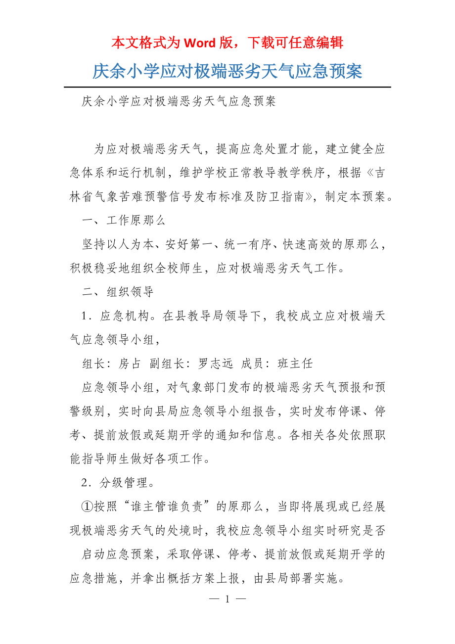 本文格式为Word版,下载可任意编辑庆余小学应对极端恶劣天气应急预案 庆余小学应对极端恶劣天气应急预案 为应对极端恶劣天气,提高应急处置才能,建立健全应急体系和运行机制,维护学校正常教导教学秩序,根据《吉林省气象苦难预警信号发布标准及防卫指南》,制定本预案 一、工作原那么 坚持以人为本、安好第一、统一有序、快速高效的原那么,积极稳妥地组织全校师生,应对极端恶劣天气工作 二、组织领导 1.应急机构在县教导局领导下,我校成立应对极端天气应急领导小组, 组长:房占 副组长:罗志远 成员:班主任 应急领导小组,对气象部门发布的极端恶劣天气预报和预警级别,实时向县局应急领导小组报告,实时发布停课、停考、提前放假或延期开学的通知和信息各相关各处依照职能指导师生做好各项工作 2.分级管理 ①按照“谁主管谁负责”的原那么,当即将展现或已经展现极端恶劣天气的处境时,我校应急领导小组实时研究是否 启动应急预案,采取停课、停考、提前放假或延期开学的应急措施,并拿出概括方案上报,由县局部署实施 ②在必要时,由县局统一安置停课、停考、提前放假或延期开学。