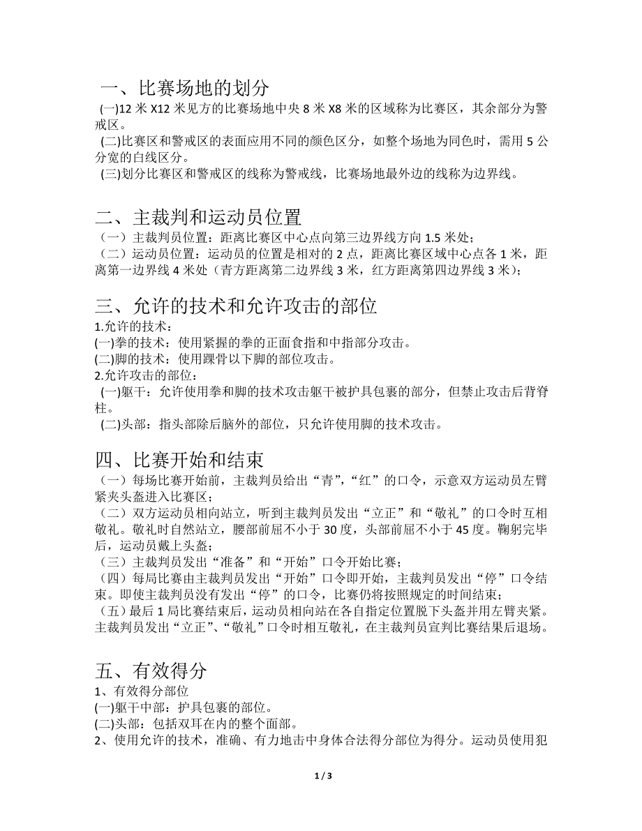 鞠躬完毕后,运动员戴上头盔;(三)主裁判员发出“准备”和“开始”口令开始比赛;(四)每局比赛由主裁判员发出“开始”口令即开始,主裁判员发出“停”口令结束即使主裁判员没有发出“停”的口令,比赛仍将按照规定的时间结束;(五)最后1局比赛结束后,运动员相向站在各自指定位置脱下头盔并用左臂夹紧主裁判员发出“立正”、“敬礼”口令时相互敬礼,在主裁判员宣判比赛结果后退场五、有效得分1、有效得分部位(一)躯干中部:护具包裹的部位二)头部:包括双耳在内的整个面部2、使用允许的技术,准确、有力地击中身体合法得分部位为得分运动员使用犯规行为得分时,所得分数视为无效3、分值:(一)击中护胸得1分,转身技术击中护胸得2分;(二)击中头部得3分,转身技术击中头部得4分;六、犯规行为的判罚 (一)以下行为将被判罚“警告”1、双脚越出边界线;2、转身背向对方运动员逃避进攻;3、倒地;4、故意回避比赛,或处于消极状态;5、抓、搂抱或推对方运动员;6、攻击对方运动员腰以下部位;7、伪装受伤;8、用膝部顶撞或攻击对方运动员;9、用拳攻击对方运动员头部;10、教练员或运动员有任何不良言行;11、提膝阻碍或逃避对方运动员的攻击。
