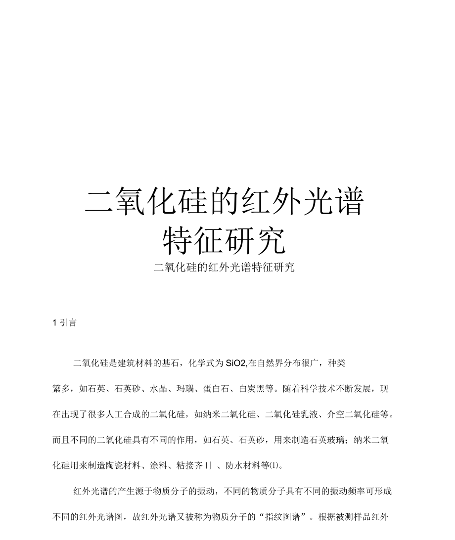 精品文档二氧化硅的红外光谱特征研究二氧化硅的红外光谱特征研究1引言二氧化硅是建筑材料的基石,化学式为SiO2,在自然界分布很广,种类繁多,如石英、石英砂、水晶、玛瑙、蛋白石、白炭黑等随着科学技术不断发展,现在出现了很多人工合成的二氧化硅,如纳米二氧化硅、二氧化硅乳液、介空二氧化硅等而且不同的二氧化硅具有不同的作用,如石英、石英砂,用来制造石英玻璃;纳米二氧化硅用来制造陶瓷材料、涂料、粘接齐I」、防水材料等⑴红外光谱的产生源于物质分子的振动,不同的物质分子具有不同的振动频率可形成不同的红外光谱图,故红外光谱又被称为物质分子的“指纹图谱”根据被测样品红外光谱的特征峰进行对比分析,可以作为物质识别和比较的重要依据傅里叶变换红外(FTIR)光谱法具有操作简单、快速灵敏、重复性好和成本低等优点,可作为二氧化硅的一种定性、快速的检测技术本文分析研究了八种不同来源的二氧化硅样品,寻找二氧化硅在其红外特征谱中的反映,比较其红外光谱的异同,提供最直接有效的鉴别方法,为人们在建筑材料上开发、研究及选用合适的二氧化硅提供理论指导2实验2.1实验仪器红外光谱在Nexus型傅立叶变换显微红外光谱仪上进行KBr压片法制样,KBr分束器,DTGSKBr检测器,分辨率:4cm1,扫描次数:64,测试范围4000~400cm"。