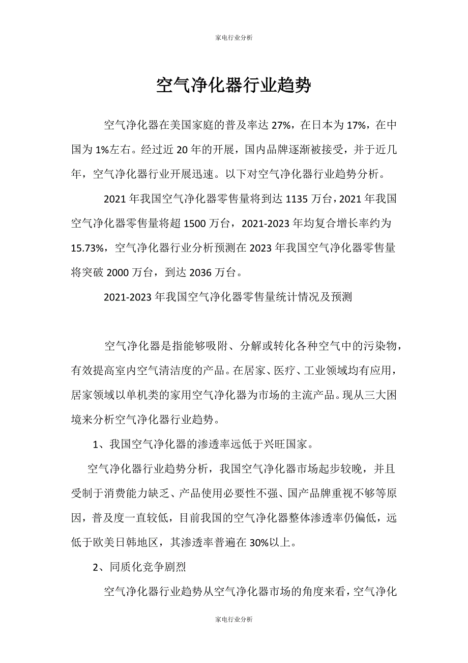 家电行业分析空气净化器行业趋势 空气净化器在美国家庭的普及率达27%,在日本为17%,在中国为1%左右经过近20年的开展,国内品牌逐渐被接受,并于近几年,空气净化器行业开展迅速以下对空气净化器行业趋势分析 2021年我国空气净化器零售量将到达1135万台,2021年我国空气净化器零售量将超1500万台,2021-2023年均复合增长率约为15.73%,空气净化器行业分析预测在2023年我国空气净化器零售量将突破2000万台,到达2036万台 2021-2023年我国空气净化器零售量统计情况及预测 空气净化器是指能够吸附、分解或转化各种空气中的污染物,有效提高室内空气清洁度的产品在居家、医疗、工业领域均有应用,居家领域以单机类的家用空气净化器为市场的主流产品现从三大困境来分析空气净化器行业趋势 1、我国空气净化器的渗透率远低于兴旺国家 空气净化器行业趋势分析,我国空气净化器市场起步较晚,并且受制于消费能力缺乏、产品使用必要性不强、国产品牌重视不够等原因,普及度一直较低,目前我国的空气净化器整体渗透率仍偏低,远低于欧美日韩地区,其渗透率普遍在30%以上。