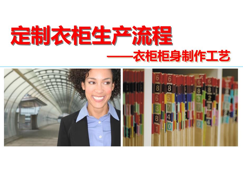 定制定制衣柜生产流程衣柜生产流程衣柜柜身制作工艺衣柜柜身制作工艺提纲:提纲:提纲:提纲:n 柜身板板材及颜色n 生产设备与流程柜身板材的基材柜身板材的基材n 实木颗粒板 柜体颜色(13种): 银湘玉、桂香莉、加州红、金花梨、美兰枫、苏香桐、苹果木、含珊玉、琥珀红、托斯卡纳印象、云轩木、艾丽丝、帕多瓦、n 中纤板 柜体颜色(5种):金花梨、百合木、苹 果木、白橡木、暖白n 夹板 柜体颜色(4种):加州红、苏香桐、金 花梨、银湘玉 夹板柜身板只能做18mm厚柜体板材的厚度及应用范围板材厚度板材厚度板材类型板材类型应用范围应用范围9mmE1级中纤板级中纤板趟门门板趟门门板背板背板格子架格子架底板底板12mmE1级中纤板级中纤板抽屉围板抽屉围板格子架围板格子架围板裤架围板裤架围板18mmE1级刨花板级刨花板/中纤板中纤板衣柜、书柜柜体衣柜、书柜柜体平开平开门门板门门板层板层板抽屉面板抽屉面板25mmE1级刨花板级刨花板/中纤板中纤板衣柜、书柜柜体衣柜、书柜柜体书台书台台面台面框架式衣柜层板框架式衣柜层板三、生产设备与流程三、生产设备与流程 每单板件引入识别条码识别条码,每个板件都具备一个唯一的身份证,里面储备有它的订单号、交货期、加工信息、产品信息等资料 有效的解决了漏单和错加工问题,并有效的对订单每个板件的加工进度进行监控。