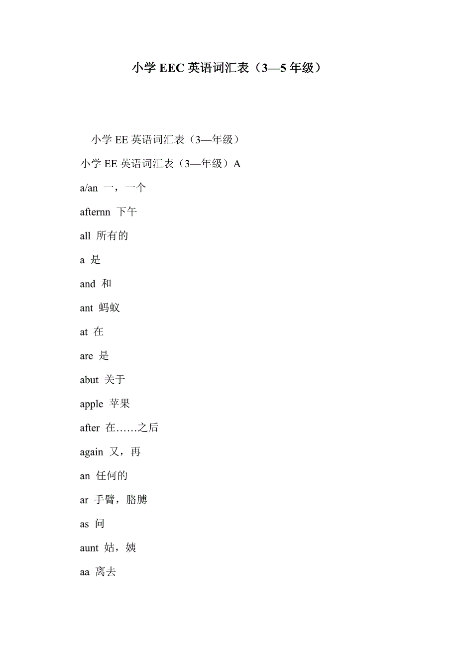 小学 EEC 英语词汇表(3—5 年级)小学 EE 英语词汇表(3—年级)小学 EE 英语词汇表(3—年级)Aa/an 一,一个afternn 下午all 所有的a 是and 和ant 蚂蚁at 在are 是abut 关于apple 苹果after 在……之后again 又,再an 任何的ar 手臂,胳膊as 问aunt 姑,姨aa 离去 alread 已经Aeria 美国anthing 任何东西ana 无论如何April 四月August 八月Australia 澳大利亚ah 啊(语气词)a 哇(语气词)ah 打喷嚏声(语气词)airplane 飞机airprt 机场alas 总是auseent 娱乐anial 动物arund 在…周围artist 艺术家astrnaut 宇航员aese 引起敬畏的Bbag 书包 ball 球be (a, is, are) 是bear 熊big 大的b 书brther 兄弟be 再见banana 香蕉bed 床behind 在 ……后面birthda 生日bla 黑色的blue 蓝色的bx 盒子bread 面包but 但是baseball 棒球bat 球拍bend 弯曲beside 在……旁边better 更好的bie 自行车 breafast 早餐balln 气球bathr 浴室beautiful 美丽的bl 吹bstre 书店buper ar 碰碰车bus 忙的bu 买befre 在…之前belt 腰带bts 靴子brr 借brn 棕色的brush 刷bus 公共汽车buttn 扣子b 靠,通过ba 向后的beah 海滩beause 因为best 最好的 bl 街区bred 心烦的building 建筑物beteen 在……之间ap 帽子ar 小汽车at 猫hair 椅子lass 班级lse 关闭e puter 计算机l 凉快的ute 可爱的,聪明的ae 蛋糕an 能andle 蜡烛hlate 巧克力lean 清洁at 上衣 ld 冷的lr 颜色unt 数数an’t 不能areful 小心的,仔细的irle 圆周,圆圈厨师ra 爆裂,打破ard 卡片hina 中国ler 店员,职员l 钟st 花费usin 堂兄弟姐妹anada 加拿大heap 便宜的hildren 孩子(复数)llar 领子afeteria 自助餐厅aera 照相机he 检查hinese 汉语 lud 云lud 多云的e 可乐ugh 咳嗽Ddad 爸爸da 日子des 桌子d 助动词dg 狗dn 向下dra 画dllar 美元dr 门dtr 医生departent stre 百货商店dining r 餐厅dish 碟子drive 驾驶dupling 饺子date 日期 Deeber 十二月dinner 晚餐dnstairs 楼下dress 给……穿衣服design 设计drp 滴dr 干的during 在…期间Eear 耳朵eight 八elephant 象eraser 橡皮ee 眼睛eighteen 十八eleven 十一eas 容易的eat 吃egg 鸡蛋English 英语ever 每一个 exerise 练习eight 八十exiting 激动人心的exited 兴奋的exuse 原谅expensive 昂贵的Egpt 埃及engineer 工程师en 享受explre 探索Ffine 好的first 第一fish 鱼five 五ft 脚fur 四fx 狐狸friend 朋友fifteen 十五fift 五十 fr 为 ……furteen 十四frt 四十full 饱的fae 脸find 发现,找到flur 面粉fr 从 ……,自于……fall 秋天fever 发烧fire statin 消防站fr 叉子Frida 星期五fun 乐趣far 远的father 爸爸Februar 二月find 找到,发现finish 完成farer 农民fantasti 神奇的fail 家人 favrite 最喜爱的feed 喂养feel 感觉fl 飞fd 食物frget 忘记frnt 前面fr 油炸食品Gget 得到giraffe 长颈鹿g 去gat 羊gd-be 再见gae 游戏great 极好的green 绿色的glve 手套gra 灰色的granda 奶奶grandpa 爷爷 glasses 眼镜gift 礼物Hhand 手have 有he 他(指男性)head 头hell 喂,嘿here 这儿,这里hi 喂hipp 河马h 怎么样happ 幸福的hat 帽子help 帮助he 嘿(语气词)hide 藏hide-n-see 捉迷藏he 家ht 热的ht dg 热狗 hungr 饿的his 他的hit 打hurt 使受伤hang 悬挂happen 发生headahe 头痛hne 蜂蜜hpe 希望hspital 医院hundred 百hairpin 发卡her 她(宾格)her 家庭作业hurr 赶快hard 猛烈的Haaii 夏威夷hear 听high 高的hiing 徒步旅行hbb 爱好hlida 假期 II 我in 在……里inset 昆虫it 它is 是int 到……里idea 主意interesting 有趣的et 飞机up 跳uie 汁a 果酱aet 夹克anuar 一月eans 牛仔裤in 参加ul 七月une 六月apan 日本 b 工作ust 仅仅angar 袋鼠id 小孩nee 膝盖n 知道ithen 厨房napsa 背包ite 风筝Llie 喜欢lin 狮子l 看late 晚的,迟的let’s (let us) 让我们light 灯lve 爱,喜爱leg 腿librar 图书馆lift 抬,举 lng 长的lunh 午餐lantern 灯笼living r 起居室last 最后的little 少许live 居住lt 许多laundr 洗衣店learn 学习left 左边lenade 柠檬汁list 清单luggage 行李e 我eet 遇到iss 小姐妈妈ne 猴子nster 怪物 rning 早晨uth 嘴我的ae 制作an 许多il 牛奶nda 星期一n 月亮re 更多的uh 多的ath 数学ine 我的ix 混合rs 女士,夫人usi 音乐atter 事a 可以arh 三月a 五月inute 分钟ther 母亲vie 电影 useu 博物馆dal 模型untain Nnae 名字nest 巢,窝nie 美好的night 晚上nine 九n 不nse 鼻nt 不nuber 数字next 下一个nineteen 十九n 现在ne 新的Ne ear’s Da 元旦ninet 九十near 近的nespaper 报纸 Nveber 十一月never 从不h 哦(表惊讶、赞叹等)(a) 好n 在……上面ne 一pen 打开uh 哎呦(表剧痛)ut 向外面x 牛’l 点钟ff 离开,脱离ld 年长的,旧的range 橘子哎呦(感叹词,表示疼痛)h 哎呀(语气词)ps 哎呦(语气词)ver 越过,超过tber 十月 Ppanda 熊猫penil 铅笔pi 捡,摘piture 图画please 请put 放pants 裤子pear 梨pineapple 菠萝pizza 比萨饼pla 玩prett 漂亮的pass 传递panae 薄烤饼,平锅饼pan 平底锅pian 钢琴par 公园phe 啊,哎pht 照片pliean 警察pr 可怜的 pst ffie 邮局present 礼物pet 兜子口袋purple 紫色的Paris 巴黎pen pal 笔友peple 人pini 野餐pie 馅饼piee pilt 飞行员plae 地方plan 计划plane 飞机planet 行星plie statin 警察局pl 游泳池pur 下大雨pratie 练习praid 金字塔Q queen 女王,王后quiet 安静的quil 迅速地Rrabbit 兔子read 准备r 房间run 跑red 红色的read 读ride 骑restaurant 餐馆right 正确的,恰当的rbt 机器人rller aster 过车rain 雨rainat 雨衣rest 休息runn 流鼻涕的S seal 海豹see 看到seven 七she 她(指女性)shirt 衬衫she 鞋sister 姐妹sit 坐six 六sall 小的s 如此srr 对不起stand 站sure 当然sandih 三明治Saturda 星期六sa 说see 寻找,搜索seventeen 十七sh 出示,给……看si 有病的sixteen 十六 sixt 六十sate 滑冰sirt 裙子sleep 睡觉sn 雪snball 雪球snan 雪人sap 肥皂s 袜子se 一些sn 不久star 星星sun 太