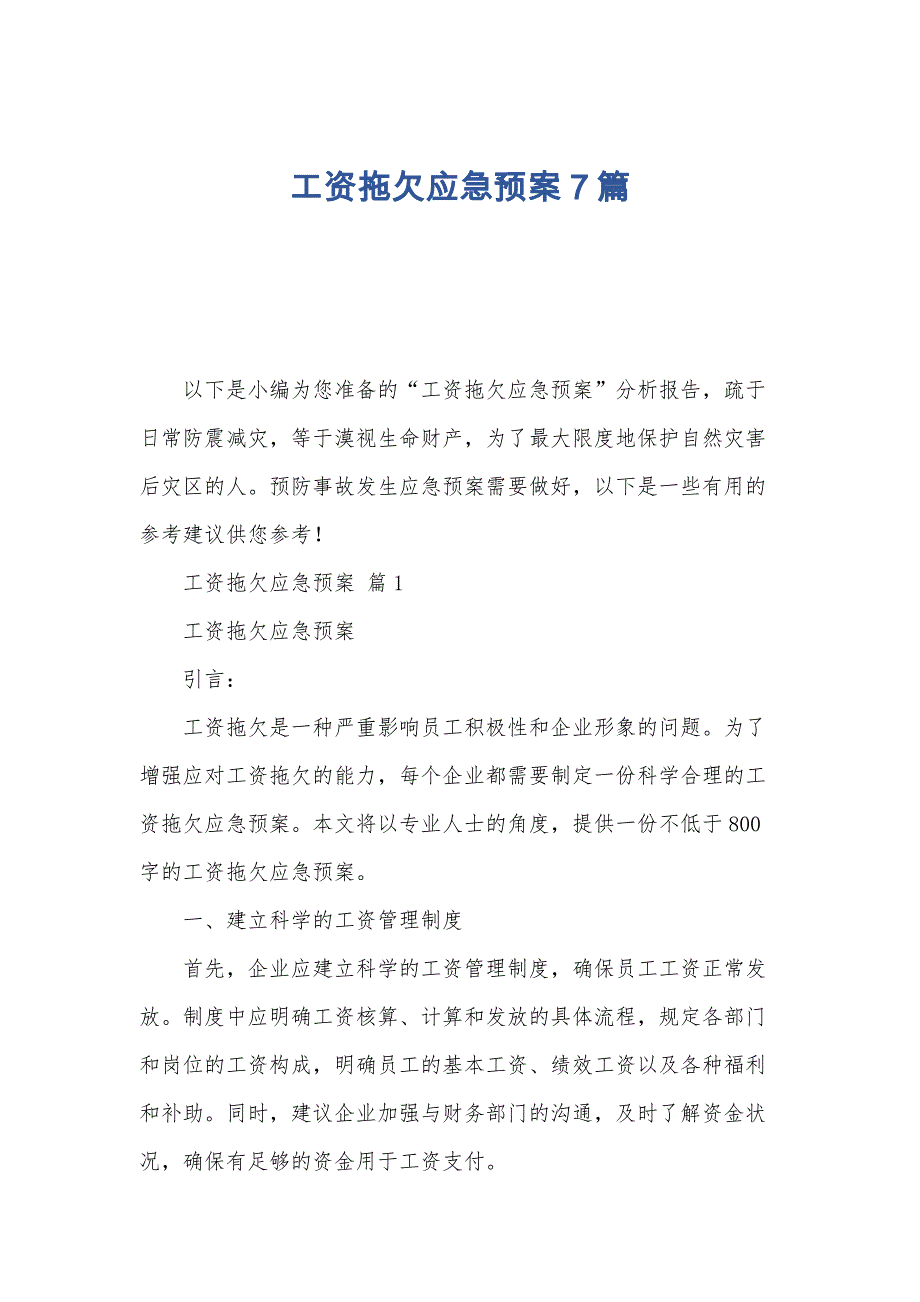 工资拖欠应急预案7篇 以下是小编为您准备的“工资拖欠应急预案”分析报告,疏于日常防震减灾,等于漠视生命财产,为了最大限度地保护自然灾害后灾区的人预防事故发生应急预案需要做好,以下是一些有用的参考建议供您参考! 工资拖欠应急预案 篇1 工资拖欠应急预案 引言: 工资拖欠是一种严重影响员工积极性和企业形象的问题为了增强应对工资拖欠的能力,每个企业都需要制定一份科学合理的工资拖欠应急预案本文将以专业人士的角度,提供一份不低于800字的工资拖欠应急预案 一、建立科学的工资管理制度 首先,企业应建立科学的工资管理制度,确保员工工资正常发放制度中应明确工资核算、计算和发放的具体流程,规定各部门和岗位的工资构成,明确员工的基本工资、绩效工资以及各种福利和补助同时,建议企业加强与财务部门的沟通,及时了解资金状况,确保有足够的资金用于工资支付 二、建立预算管理制度 企业应根据经济状况和发展规划制定合理的财务预算,将工资支出纳入预算范围,并合理安排备用资金,以应对紧急情况预算管理制度能帮助企业提前预判和规避潜在的工资拖欠风险,确保工资按时发放。