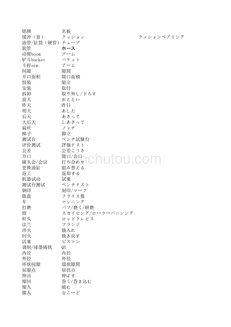 铭牌 名板缓冲(套) クッション クッションベアリング油管/缸筒(硬管) チューブ软管 ホース动臂boom ブーム铲斗bucket バケット斗杆arm アーム间隙 隙間开口面积 開口面積组装 組立安装 取付拆卸 取り外し/下ろす前天 おととい昨天 昨日明天 あした后天 あさって大后天 しあさって扁丝 ノッチ梯子 脚立测试台 ベンチ試験台评价测试 評価テスト公差 公差こうさ开口 開口/合口碰头会/会议 打ち合わせ更换油缸 組み替える返工 返却する机器试动 試乗测试台测试 ベンチテスト钢印 刻印/マーク铣盘 フライス盤车 マシニング打磨 バフ/磨く/研磨镗 スカイビング/ローラーバニシング杆头 ロッドクレビス法兰 フランジ淬火 焼入れ回火 焼き戻す活塞 ピストン调制/球墨铸铁 QT内径 内径外径 外径环状间隙 環状隙間屈服点 屈伏点伸出 伸ばす缩回 巻く/巻き込む缩入 縮む媒人 なこーど耳环 クレビス渗碳 浸炭验货 立会划痕 縦傷碰伤 打痕防锈 防錆涂抹 塗布螺栓 ボルト关节轴承 継械加工面 機械加工面铰接 中折れ轴套 BU粗加工 粗加工热处理 焼鈍精加工 仕上げ尺寸 寸法电镀 メッキ发货 出荷针孔 ピンホール(Pin Hole)油嘴 グリスニップル黄油 グリス规格 仕様破碎机油缸 クラッシャジャッキ螺丝孔 タップ穴开口角度 穴明け角度夹紧油缸 グリッパ造船 造船支撑带 ウェアリング摩擦系数 摩擦係数树脂 樹脂触摸无明显手感 爪にかかるような傷ではない 極浅い縦傷干摩擦 乾燥摩擦附件 添付資料参数 パラメータ开口部 開口部目视 目視支撑力 支持力抽动 摺動行程 ストローク工程师 エンジニア撞击/碰撞 衝突显微镜 顕微鏡破损/脱落 剥離环节/步骤 工程小车/转运车 搬送車组装车间 組立場尖角清洗槽 洗浄受けローラー作业台 作業台吊带 スリング旋转360度 360度回す装入 組み込む检验员 検査員手电筒 懐中電灯材质 材質电镀工艺 メッキ条件接头 テップ(tap)测压口 クッションポート/ゲージポート测试 計測拧紧 締め付ける提前 前倒し抽检/抽样 抜き取り合同 契約添加附件发送 を添付送信する神钢吊机 コベルコクレーン株式会社报价单 見積書批次 LOT/包装费 梱包費版本图纸 バージョン図面软氮化 タフトライド高周波淬火 高周波焼入れ商务函 ビジネスレター日期 日時厦门 アモイ请审阅 ご審査请批注 ご注釈请答复 ご回答请传阅 ご回覧合作项目 合作案件/合作項目がっさく敬业 職業精神专业 プロ能力工程机械 工事機械产业/行业 産業持续低迷 低迷継続市场竞争 市場競争钢材 鋼材持续下跌(价格) 下落続き日元汇率下降 円安低点 谷底(たにそこ)下降 降下こうか增强竞争力 競争力強化要求、需求(客户) 依頼降价 コストダウン生产工艺 生産工芸升级材料 材料を上級させる采取苛求的态度 厳しい態度を取る高层(领导) トップ層战略合作 戦略合作超级快递 スーパーエクスプレス底漆 下塗り(したぬり)面漆 上塗り(うわぬり)环氧树脂 エポキシ樹脂 涂料 塗料珩磨 ホーニング(仕上げ)粗磨 粗研削(そけんさく)精磨 精研削指出 指摘端盖/导向套 ロッドカバー粗糙度 ラフネス/粗さ(あらさ)粗糙度仪 粗さ計回火处理 テンパー処理过滤 濾過(ろか)。