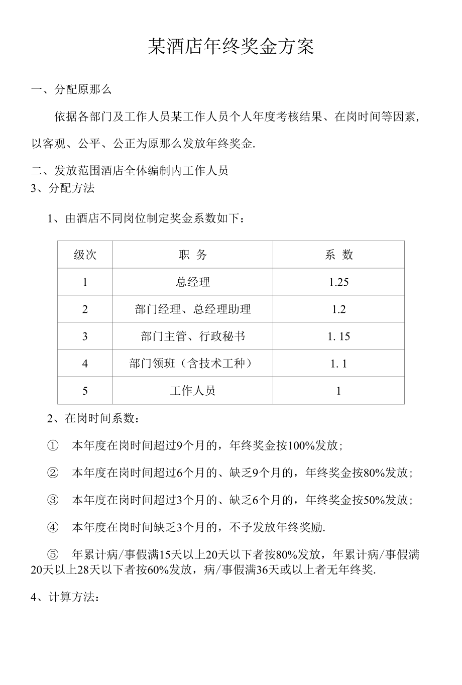 某酒店年终奖金方案一、分配原那么依据各部门及工作人员某工作人员个人年度考核结果、在岗时间等因素, 以客观、公平、公正为原那么发放年终奖金.二、发放范围酒店全体编制内工作人员3、分配方法1、由酒店不同岗位制定奖金系数如下:级次职 务系 数1总经理1.252部门经理、总经理助理1.23部门主管、行政秘书1. 154部门领班(含技术工种)1. 15工作人员12、在岗时间系数:① 本年度在岗时间超过9个月的,年终奖金按100%发放;② 本年度在岗时间超过6个月的、缺乏9个月的,年终奖金按80%发放;③ 本年度在岗时间超过3个月的、缺乏6个月的,年终奖金按50%发放;④ 本年度在岗时间缺乏3个月的,不予发放年终奖励.⑤ 年累计病/事假满15天以上20天以下者按80%发放,年累计病/事假满20天以上28天以下者按60%发放,病/事假满36天或以上者无年终奖.4、计算方法:1、基本标准=本年度工资总和/在岗时间(月)2、某工作人员个人年终奖金=基本标准X岗位奖金系数义在岗时间系数如:酒店现有总经理1名(基本标准工资5000元/月,入职10个月),部 门经理1名(基本标准工资2000元/月,入职5个月),工作人员3名(基本 标准工资1000元/月),其中A工作人员为6月30日之前进入公司或者机构 且在岗时间超过6个月,B工作人员为7月1日以后10月1日之前进入公司或 者机构且在岗时间超过3个月,C工作人员为10月1日以后进入公司或者机 构.那么:总经理的年终奖金二5000*岗位奖金系数1.25*在岗时间系数100%=6250元 部门经理的年终奖金二2000*岗位奖金系数1. 20*在岗时间系数80%= 1920元 A工作人员的年终奖金二1000*岗位奖金系数1*在岗时间系数100%= 1000元 B工作人员的年终奖金二1000*岗位奖金系数1*在岗时间系数50%=500元 C工作人员的年终奖金二0元5、责任部门:1、各部门:年底统计本年度在岗人员在岗时间交予人事部.2、人事部:对各部门统计的人员在岗时间进行审核与统计,交予财务部.3、财务部:根据人事部的统计结果,计算出工作人员年终奖金予以发放.6、发放时间:每年的元宵节发放.某公司或者机构人事部XXXX年X月X日。