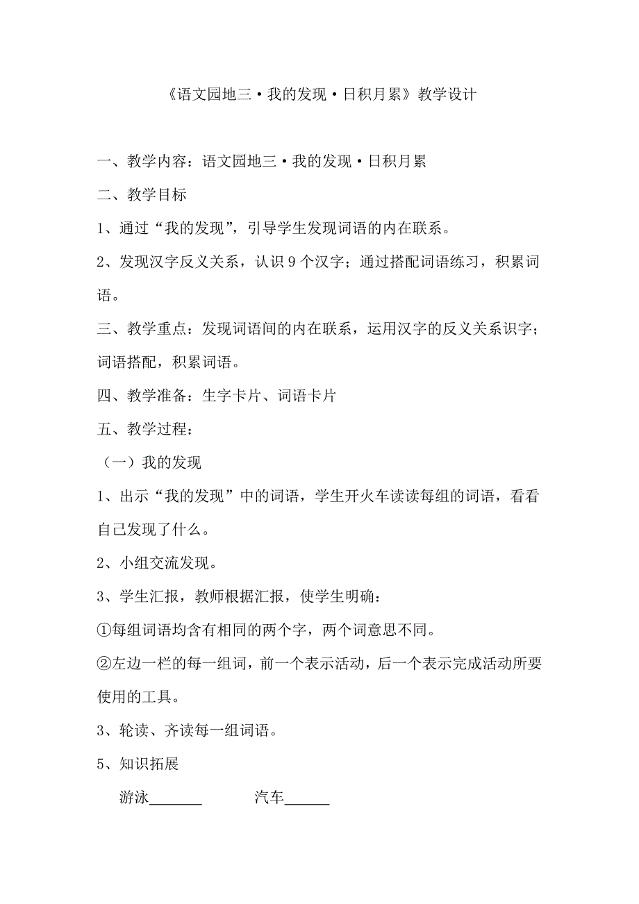 《语文园地三·我的发现·日积月累》教学设计一、教学内容:语文园地三·我的发现·日积月累二、教学目标1、通过“我的发现”,引导学生发现词语的内在联系2、发现汉字反义关系,认识9个汉字;通过搭配词语练习,积累词语三、教学重点:发现词语间的内在联系,运用汉字的反义关系识字;词语搭配,积累词语四、教学准备:生字卡片、词语卡片五、教学过程:(一)我的发现1、出示“我的发现”中的词语,学生开火车读读每组的词语,看看自己发现了什么2、小组交流发现3、学生汇报,教师根据汇报,使学生明确:①每组词语均含有相同的两个字,两个词意思不同②左边一栏的每一组词,前一个表示活动,后一个表示完成活动所要使用的工具3、 轮读、齐读每一组词语5、知识拓展 游泳 汽车 加油 写字 (二)日积月累1、读读认认(1)学生读读认识的字,并借助拼音读读不认识的字,看看每组再从个字之间的关系2)教师出题,学生抢答,说出反义词3)分男分女对比读或同桌对比读4)去掉中间的破折号,看看有什么发现,熟记反义词语“宽窄、贵贱、善恶、强弱、胜败、内外”,并适当应用。