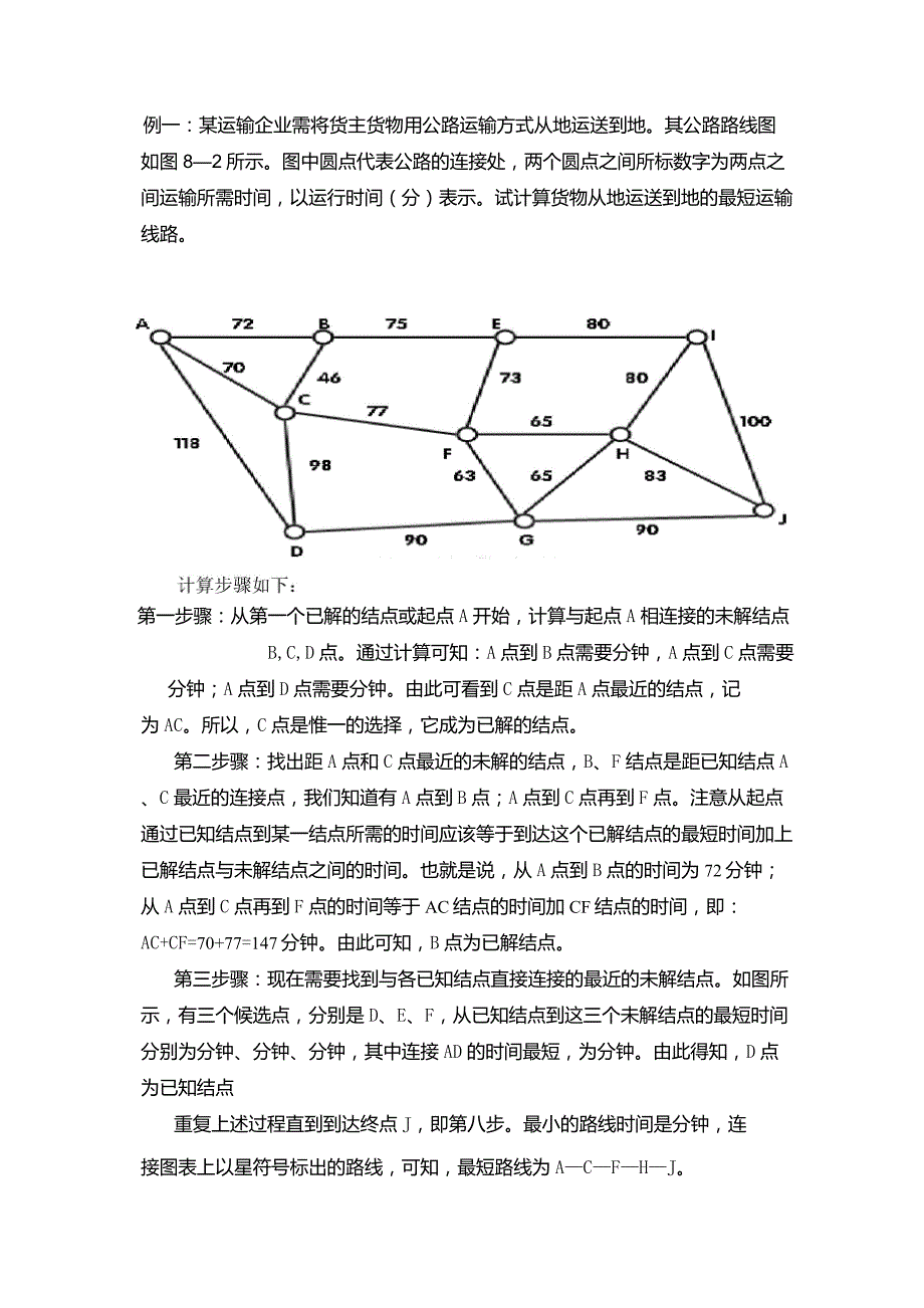 例一:某运输企业需将货主货物用公路运输方式从地运送到地其公路路线图如图8—2所示图中圆点代表公路的连接处,两个圆点之间所标数字为两点之间运输所需时间,以运行时间(分)表示试计算货物从地运送到地的最短运输线路第一步骤:从第一个已解的结点或起点A开始,计算与起点A相连接的未解结点B,C,D点通过计算可知:A点到B点需要分钟,A点到C点需要分钟;A点到D点需要分钟由此可看到C点是距A点最近的结点,记为AC所以,C点是惟一的选择,它成为已解的结点第二步骤:找出距A点和C点最近的未解的结点,B、F结点是距已知结点A、C最近的连接点,我们知道有A点到B点;A点到C点再到F点注意从起点通过已知结点到某一结点所需的时间应该等于到达这个已解结点的最短时间加上已解结点与未解结点之间的时间也就是说,从A点到B点的时间为72分钟;从A点到C点再到F点的时间等于AC结点的时间加CF结点的时间,即:AC+CF=70+77=147分钟由此可知,B点为已解结点第三步骤:现在需要找到与各已知结点直接连接的最近的未解结点如图所示,有三个候选点,分别是D、E、F,从已知结点到这三个未解结点的最短时间分别为分钟、分钟、分钟,其中连接AD的时间最短,为分钟。