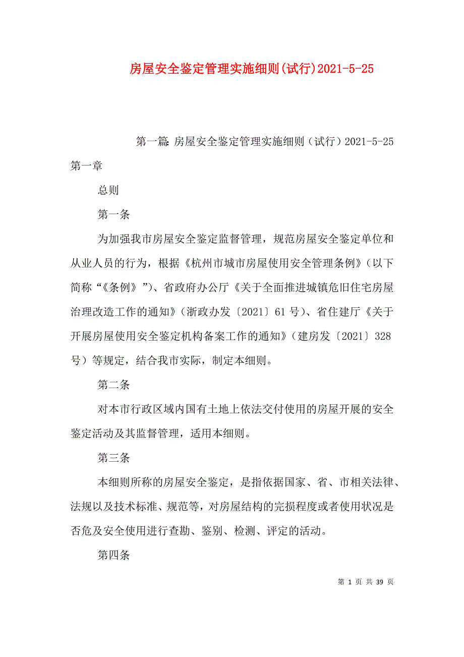 第五章附则 第二十九条 本市行政区域内集体土地上的房屋进行房屋安全鉴定,可参照本细则执行 第三十条 本细则自2021年3月1日起实施,由杭州市房屋安全鉴定事务管理中心负责解释 第二篇:关于印发《杭州市房屋安全鉴定管理实施细则(试行)》的通知2021-2-29关于印发《杭州市房屋安全鉴定管理实施细则(试行)》的通知 杭房鉴中心〔2021〕5号 各有关单位: 根据《杭州市城市房屋使用安全管理条例》、省政府办公厅《关于全面推进城镇危旧住宅房屋治理改造工作的通知》(浙政办发〔2021〕61号)、省住建厅《关于开展房屋使用安全鉴定机构备案工作的通知》(建房发〔2021〕328号)等规定,为进一步做好我市房屋安全鉴定日常监督管理工作,切实贯彻执行上述备案制度,结合我市实际,制定了《杭州市房屋安全鉴定管理实施细则(试行)》,现印发给你们,请认真贯彻执行 附件:杭州市房屋安全鉴定管理实施细则(试行) 杭州市房屋安全鉴定事务管理中心 2021年2月29日 抄送:局安全处、法规处,各区、县(市)住建(房管)局 杭州市房屋安全鉴定管理实施细则(试行) 第一章 总则 第一条 为加强我市房屋安全鉴定监督管理,规范房屋安全鉴定单位和从业人员的行为,根据《杭州市城市房屋使用安全管理条例》(以下简称“《条例》”)、省政府办公厅《关于全面推进城镇危旧住宅房屋治理改造工作的通知》(浙政办发〔2021〕61号)、省住建厅《关于开展房屋使用安全鉴定机构备案工作的通知》(建房发〔2021〕328号)等规定,结合我市实际,制定本细则。
