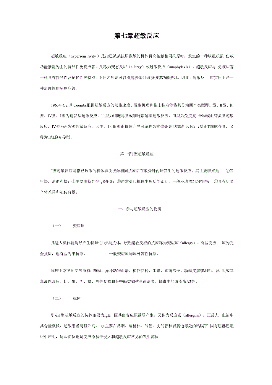 早期相反应发生于接触变 应原后数秒钟内,可持续数小时,主要由组织胺引起;晚期相反应一般发生在与变应原接触后6~12小时内,可持续数天,主要由LTs和PGD2所致,PAF及嗜酸性粒细胞释放的活性介质也起一定作用I型变态反应发生机制见图7- 1三、临床常见的I型超敏反应性疾病(一) 过敏性休克过敏性休克是最严重的一种I型超敏反应性疾病,主要由用药或注射异种血清引起1. 药物过敏性休克 以青霉素引起者最为常见青霉素本身无免疫原性,但其降解产物青霉噻唑和 青霉烯酸可与人体内的蛋白质结合获得免疫原性,进而刺激机体产生IgE,使之致敏当机体再次接触青 霉噻唑或青霉烯酸后,可诱发过敏反应,严重者导致过敏性休克,甚至死亡青霉素在弱碱性溶液中容易 降解,因而使用时应新鲜配制值得注意的是,有些人初次注射青霉素也可能发生过敏性休克,这可能是 曾吸入过青霉菌孢子或使用过被青霉素污染的注射器等医疗器械,机体已处于致敏状态之故其他药物如普鲁卡因、链霉素、有机碘等,偶尔也可引起过敏性休克2. 血清过敏性休克血清过敏性休克又称血清过敏症或再次血清病常发生于既往曾用过动物免疫 血清,机体已处于致敏状态,后来再次接受同种动物免疫血清的个体。