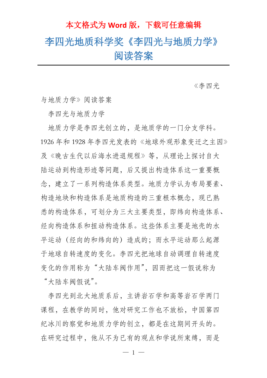 本文格式为Word版,下载可任意编辑李四光地质科学奖《李四光与地质力学》阅读答案 《李四光与地质力学》阅读答案 李四光与地质力学 地质力学是李四光创立的,是地质学的一门分支学科1926年和1928年李四光发表的《地球外观形象变迁之主因》及《晚古生代以后海水进退规程》等,从理论上探讨自大陆运动到构造形迹等问题,后又提出构造体系这一重要概念,建立了一系列构造体系类型地质力学认为布局要素、构造地块和构造体系是地质构造的三重根本概念,现已熟悉的构造体系,可划分为三大主要类型,即纬向构造体系、经向构造体系和扭动构造体系这些体系主要是地壳的水平运动(经向的和纬向的)造成的;而水平运动那么起源于地球自转速度的变化李四光把地球自动调理自转速度变化的作用称为“大陆车阀作用”,因而把这一假说称为“大陆车阀假说” 李四光到北大地质系后,主讲岩石学和高等岩石学两门课程,在教学的同时,他对研究工作也不放松,中国第四纪冰川的察觉和地质力学的创立,都是在这期间开头的在研究过程中,他从不为已有的观点和学说所束缚,而是按照自然规律,去探索尚未被人们熟悉和掌管的真理。