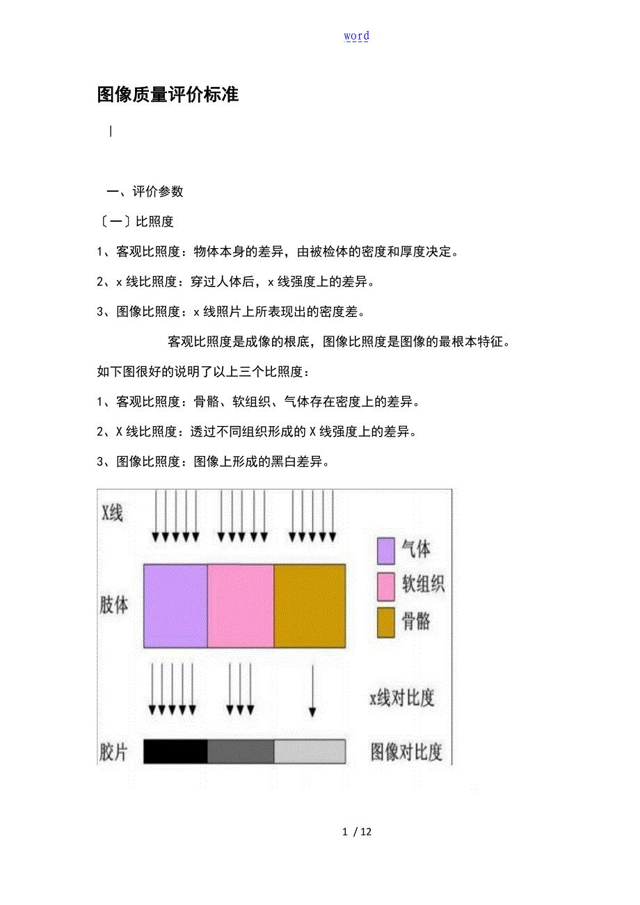 word图像质量评价标准 | 一、评价参数 〔一〕比照度1、客观比照度:物体本身的差异,由被检体的密度和厚度决定2、x线比照度:穿过人体后,x线强度上的差异3、图像比照度:x线照片上所表现出的密度差 客观比照度是成像的根底,图像比照度是图像的最根本特征如下图很好的说明了以上三个比照度: 1、客观比照度:骨骼、软组织、气体存在密度上的差异2、X线比照度:透过不同组织形成的X线强度上的差异3、图像比照度:图像上形成的黑白差异 比照度分辨率 是指将客观比照度转换成图像比照度的能力 分辨率高的成像装置可将低比照的组织区分开;分辨率低的成像装置只能将高比照的组织区分开例如:CT与平片左图是普通平片,属于分辨率低的装置〔X线机〕摄取的片子;右图是胸部CT横断片,属于高分辨率的装置〔CT机〕摄取的片子对低比照的组织的区分能力,CT高于平片〔即分辨率高的成像装置可将低比照的组织区分开〕,而平片只能区分差异较大组织〔即分辨率低的成像装置只能将高比照的组织区分开〕 〔二〕模糊 1、指物体的边界不清楚2、原因:每个物点的像向周围有不同程度的扩展3、影响:降低了图像的清晰度空间分辨率:区分相互靠近的两个物体细节的能力。