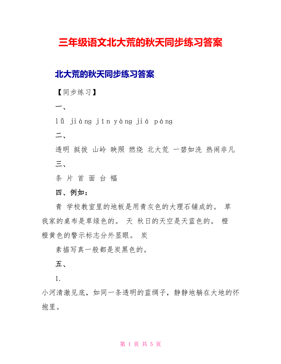 三年级语文北大荒的秋天同步练习答案北大荒的秋天同步练习答案【同步练习】一、lǚ jiànɡ jǐn yànɡ jiá pánɡ二、透明 挺拔 山岭 映照 燃烧 北大荒 一碧如洗 热闹非凡三、条 片 首 面 台 幅四、例如:青 学校教室里的地板是用青灰色的大理石铺成的 草 我家的桌布是草绿色的 天 秋日的天空是天蓝色的 橙 橙黄色的警示标志分外显眼 炭 素描写真一般都是炭黑色的五、1. 小河清澈见底,如同一条透明的蓝绸子,静静地躺在大地的怀抱里2. 一群小鱼顶着水游过来,明镜一样的水面顿时漾起了一道道波纹3. 如同一个个小铜铃4. 大象的耳朵一样六、原野热闹非凡 大豆 高粱 榛树 成片、哗啦啦、乐呵呵、一团团、燃烧 愉快、喜悦【拓展进步】八、1. 冰天雪地 茂密2. 4 总 分3. 我国的领土广阔 我国的物产丰富 我国的矿产资种类多,分布很广,储量大4. 她像一个巨人,屹立在世界的东方5. 这篇短文从领土、物产、矿产资三个方面介绍了得意的祖国《北大荒的秋天》课文原文九月,从第一片树叶落地开始,北大荒的秋天也就来了天空一碧如洗,只有在黄昏,西边的天上才会有几缕流云这些流云在落日的映照下,转眼间变成一道银灰、一道橘黄、一道血红、一道绛紫,就象是美丽的仙女在空中抖动着五彩斑斓的锦缎。