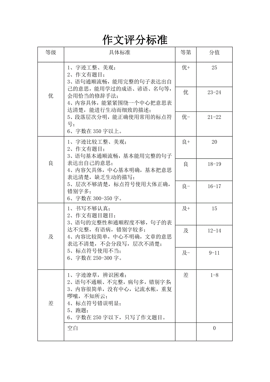 作文评分标准等级具体标准等第分值优1、字迹工整、美观;2、作文有题目;3、语句通顺流畅,能用完整的句子表达出自己的意思,能用学过的成语、谚语、名句等,会用恰当的修辞手法;4、内容具体,能紧紧围绕一个中心把意思表达清楚,能进行生动而细致的描述;5、段落层次分明,能正确使用常用的标点符号;6、字数在350字以上优+25优23-24优-21-22良1、字迹比较工整、美观;2、作文有题目;3、语句基本通顺流畅,基本能用完整的句子表达出自己的意思;4、内容欠具体,中心基本明确,基本把意思表达清楚,缺乏生动的描写;5、层次不够清楚,标点符号使用大体正确,错别字多;6、字数在300-350字良+20良18-19良-16-17及1、书写不够认真;2、作文有题目题目;3、语句的完整性和通顺程度不够,句子的表达不完整,有语病,错别字较多;4、内容比较简单,中心不明确,文章的意思表达不清楚,不会分段写,层次不清楚;5、标点符号使用不当;6、字数在250-300字及+15及12-14及-9-11差1、字迹潦草,辨识困难;2、语句不通顺、不完整,病句多,错别字多;3、内容很简单,没有中心,记流水帐,重复啰嗦,不知所云;4、标点符号错误明显;5、跑题;6、字数在250字以下,只写了作文题目。