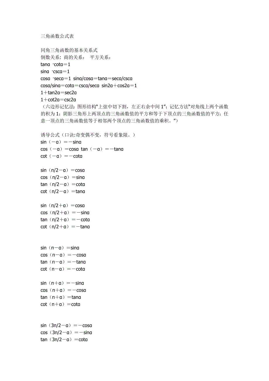三角函数公式表 同角三角函数的基本关系式 倒数关系: 商的关系: 平方关系: tanα ·cotα=1 sinα ·cscα=1 cosα ·secα=1 sinα/cosα=tanα=secα/cscα cosα/sinα=cotα=cscα/secα sin2α+cos2α=1 1+tan2α=sec2α 1+cot2α=csc2α (六边形记忆法:图形结构“上弦中切下割,左正右余中间 1”;记忆方法“对角线上两个函 数的积为 1;阴影三角形上两顶点的三角函数值的平方和等于下顶点的三角函数值的平方 ;任意一顶点的三角函数值等于相邻两个顶点的三角函数值的乘积 诱导公式(口诀:奇变偶不变,符号看象限 sin(-α)=-sinα cos(-α)=cosα tan(-α)=-tanα cot(-α)=-cotα sin(π/2-α)=cosα cos(π/2-α)=sinα tan(π/2-α)=cotα cot(π/2-α)=tanα sin(π/2+α)=cosα cos(π/2+α)=-sinα tan(π/2+α)=-cotα cot(π/2+α)=-tanα sin(π-α)=sinα cos(π-α)=-cosα tan(π-α)=-tanα cot(π-α)=-cotα sin(π+α)=-sinα cos(π+α)=-cosα tan(π+α)=tanα cot(π+α)=cotα sin(3π/2-α)=-cosα cos(3π/2-α)=-sinα tan(3π/2-α)=cotα cot(3π/2-α)=tanα sin(3π/2+α)=-cosα cos(3π/2+α)=sinα tan(3π/2+α)=-cotα cot(3π/2+α)=-tanα sin(2π-α)=-sinα cos(2π-α)=cosα tan(2π-α)=-tanα cot(2π-α)=-cotα sin(2kπ+α)=sinα cos(2kπ+α)=cosα tan(2kπ+α)=tanα cot(2kπ+α)=cotα (其中 k∈Z) 两角和与差的三角函数公式 万能公式 sin(α+β)=sinαcosβ+cosαsinβ sin(α-β)=sinαcosβ-cosαsinβ cos(α+β)=cosαcosβ-sinαsinβ cos(α-β)=cosαcosβ+sinαsinβ tanα+tanβ tan(α+β)=—————— 1-tanα ·tanβ tanα-tanβ tan(α-β)=—————— 1+tanα ·tanβ 2tan(α/2) sinα=—————— 1+tan2(α/2) 1-tan2(α/2) cosα=—————— 1+tan2(α/2) 2tan(α/2) tanα=—————— 1-tan2(α/2) 半角的正弦、余弦和正切公式 三角函数的降幂公式 二倍角的正弦、余弦和正切公式 三倍角的正弦、余弦和正切公式 sin2α=2sinαcosα cos2α=cos2α-sin2α=2cos2α-1=1-2sin2α 2tanα tan2α=————— 1-tan2α sin3α=3sinα-4sin3α cos3α=4cos3α-3cosα 3tanα-tan3α tan3α=—————— 1-3tan2α 三角函数的和差化积公式 三角函数的积化和差公式 α+β α-β sinα+sinβ=2sin———·cos——— 2 2 α+β α-β sinα-sinβ=2cos———·sin——— 2 2 α+β α-β cosα+cosβ=2cos———·cos——— 2 2 α+β α-β cosα-cosβ=-2sin———·sin——— 2 2 1 sinα ·cosβ=-[sin(α+β)+sin(α-β)] 2 1 cosα ·sinβ=-[sin(α+β)-sin(α-β)] 2 1 cosα ·cosβ=-[cos(α+β)+cos(α-β)] 2 1 sinα ·sinβ=— -[cos(α+β)-cos(α-β)] 2 化 asinα ±bcosα 为一个角的一个三角函数的形式(辅助角的三角函数的公式集合、函数 集合 简单逻辑 任一 x∈A x∈B,记作 A B A B,B A A=B A B={x|x∈A,且 x∈B} A B={x|x∈A,或 x∈B} card(A B)=card(A)+card(B)-card(A B) (1)命题 原命题 若 p 则 q 逆命题 若 q 则 p 否命题 若 p 则 q 逆否命题 若 q,则 p (2)四种命题的关系 (3)A B,A 是 B 成立的充分条件 B A,A 是 B 成立的必要条件 A B,A 是 B 成立的充要条件 函数的性质 指数和对数 (1)定义域、值域、对应法则 (2)单调性 对于任意 x1,x2∈D 若 x1<x2 f(x1)<f(x2),称 f(x)在 D 上是增函数 若 x1<x2 f(x1)>f(x2),称 f(x)在 D 上是减函数 (3)奇偶性 对于函数 f(x)的定义域内的任一 x,若 f(-x)=f(x),称 f(x)是偶函数 若 f(-x)=-f(x),称 f(x)是奇函数 (4)周期性 对于函数 f(x)的定义域内的任一 x,若存在常数 T,使得 f(x+T)=f(x),则称 f(x) 是周期函数 (1)分数指数幂 正分数指数幂的意义是 负分数指数幂的意义是 (2)对数的性质和运算法则 loga(MN)=logaM+logaN logaMn=nlogaM(n∈R) 指数函数 对数函数 (1)y=ax(a>0,a≠1)叫指数函数 (2)x∈R,y>0 图象经过(0,1) a>1 时,x>0,y>1;x<0,0<y<1 0<a<1 时,x>0,0<y<1;x<0,y>1 a> 1 时,y=ax 是增函数 0<a<1 时,y=ax 是减函数 (1)y=logax(a>0,a≠1)叫对数函数 (2)x>0,y∈R 图象经过(1,0) a>1 时,x>1,y>0;0<x<1,y<0 0<a<1 时,x>1,y<0;0<x<1,y>0 a>1 时,y=logax 是增函数 0<a<1 时,y=logax 是减函数 指数方程和对数方程 基本型 logaf(x)=b f(x)=ab(a>0,a≠1) 同底型 logaf(x)=logag(x) f(x)=g(x)>0(a>0,a≠1) 换元型 f(ax)=0 或 f (logax)=0 数列 数列的基本概念 等差数列 (1)数列的通项公式 an=f(n) (2)数列的递推公式 (3)数列的通项公式与前 n 项和的关系 an+1-an=d an=a1+(n-1)d a,A,b 成等差 2A=a+b m+n=k+l am+an=ak+al 等比数列 常用求和公式 an=a1qn_1 a,G,b 成等比 G2=ab m+n=k+l aman=akal 不等式 不等式的基本性质 重要不等式 a>b b<a a>b,b>c a>c a>b a+c>b+c a+b>c a>c-b a>b,c>d a+c>b+d a>b,c>0 ac>bc a>b,c<0 ac<bc a>b>0,c>d>0 ac<bd a>b>0 dn>bn(n∈Z,n>1) a>b>0 > (n∈Z,n>1) (a-b)2≥0 a,b∈R a2+b2≥2ab |a|-|b|≤|a±b|≤|a|+|b| 证明不等式的基本方法 比较法 (1)要证明不等式 a>b(或 a<b),只需证明 a-b>0(或 a-b<0=即可 (2)若 b>0,要证 a>b,只需证明 , 要证 a<b,只需证明 综合法 综合法就是从已知或已证明过的不等式出发,根据不等式的性质推导出欲证的不等 式(由因导果)的方法。