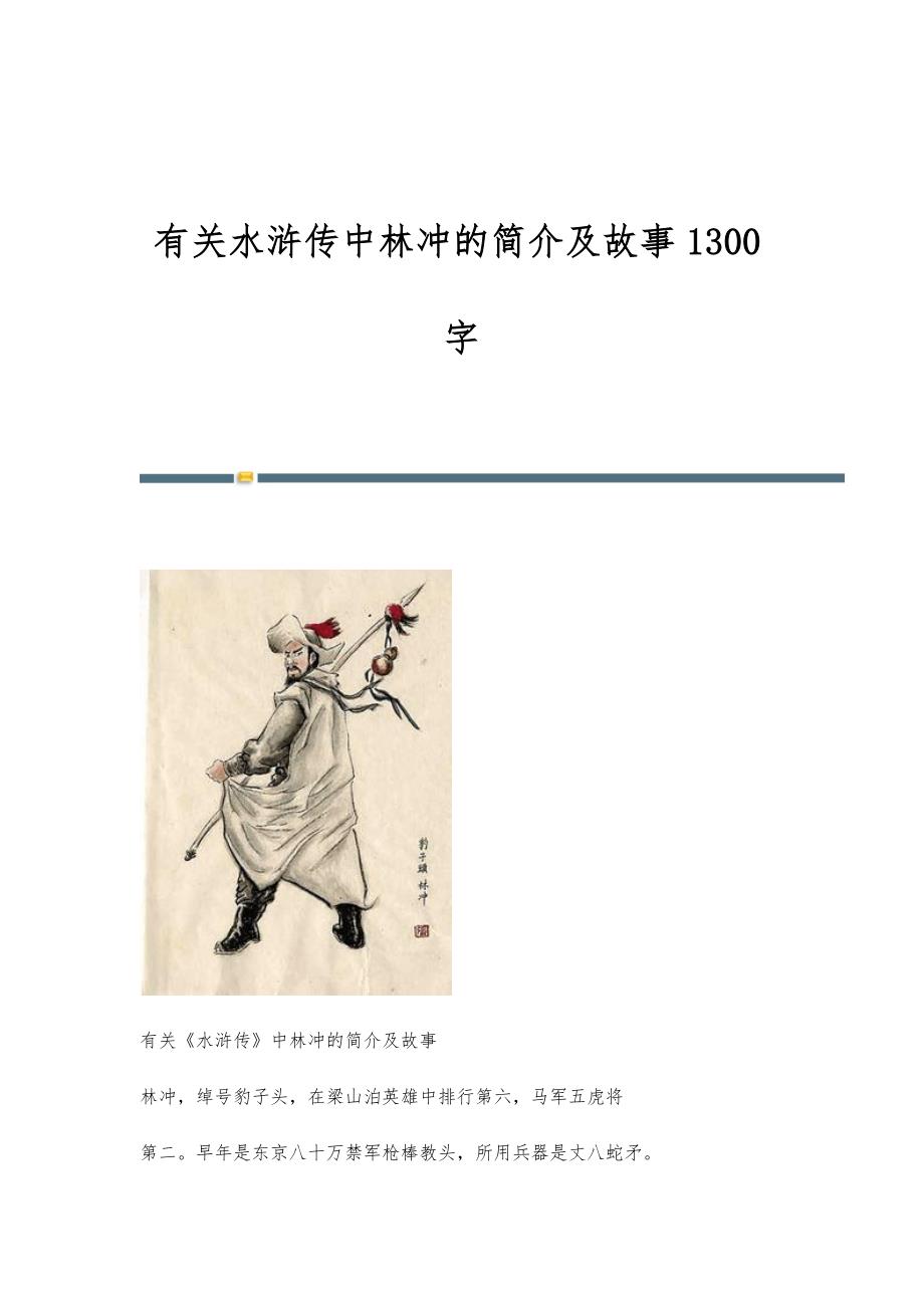 有关水浒传中林冲的简介及故事1300字 有关《水浒传》中林冲的简介及故事林冲,绰号豹子头,在梁山泊英雄中排行第六,马军五虎将第二早年是东京八十万禁军枪棒教头,所用兵器是丈八蛇矛生性耿直,爱交好汉因他的妻子长得漂亮,被高俅儿子高衙内调戏,自己也被高俅陷害,给告上了朝廷在发配沧州时,幸亏鲁智深在野猪林相救,才保住性命被发配沧州牢城看守天王堂草料场时,又遭高俅心腹陆谦放火烧毁林冲看的草料场,使得林冲再次无后路可退,林冲忍无可忍杀了高球手下陆谦,被好友柴进推荐,冒着风雪连夜投奔梁山泊,但被梁山寨主白衣秀士王伦所不容在晁盖、吴用劫取了生辰纲上梁山后,王伦不容这些英雄,林冲一气之下杀了王伦,把晁盖推上了梁山泊首领之位林冲武艺高强,打了许多胜仗在征讨江浙一带方腊率领的起义军胜利后,林冲得了中风,被迫留在杭州六和寺养病,由武松照顾,半年后病故,追封忠武郎误入白虎堂高太尉的儿子高衙内想占有林冲之妻,于是陆虞侯、富安等设计陷害林冲事先暗中命人将自己的宝刀卖与林冲,过了几日后,再让下人以看刀为名将林冲带入太尉府,欺负林冲不认识路把他骗到军机要地白虎堂白虎堂为军机重地,林冲这等下级军官是没资格进的,更不许带刀进入。