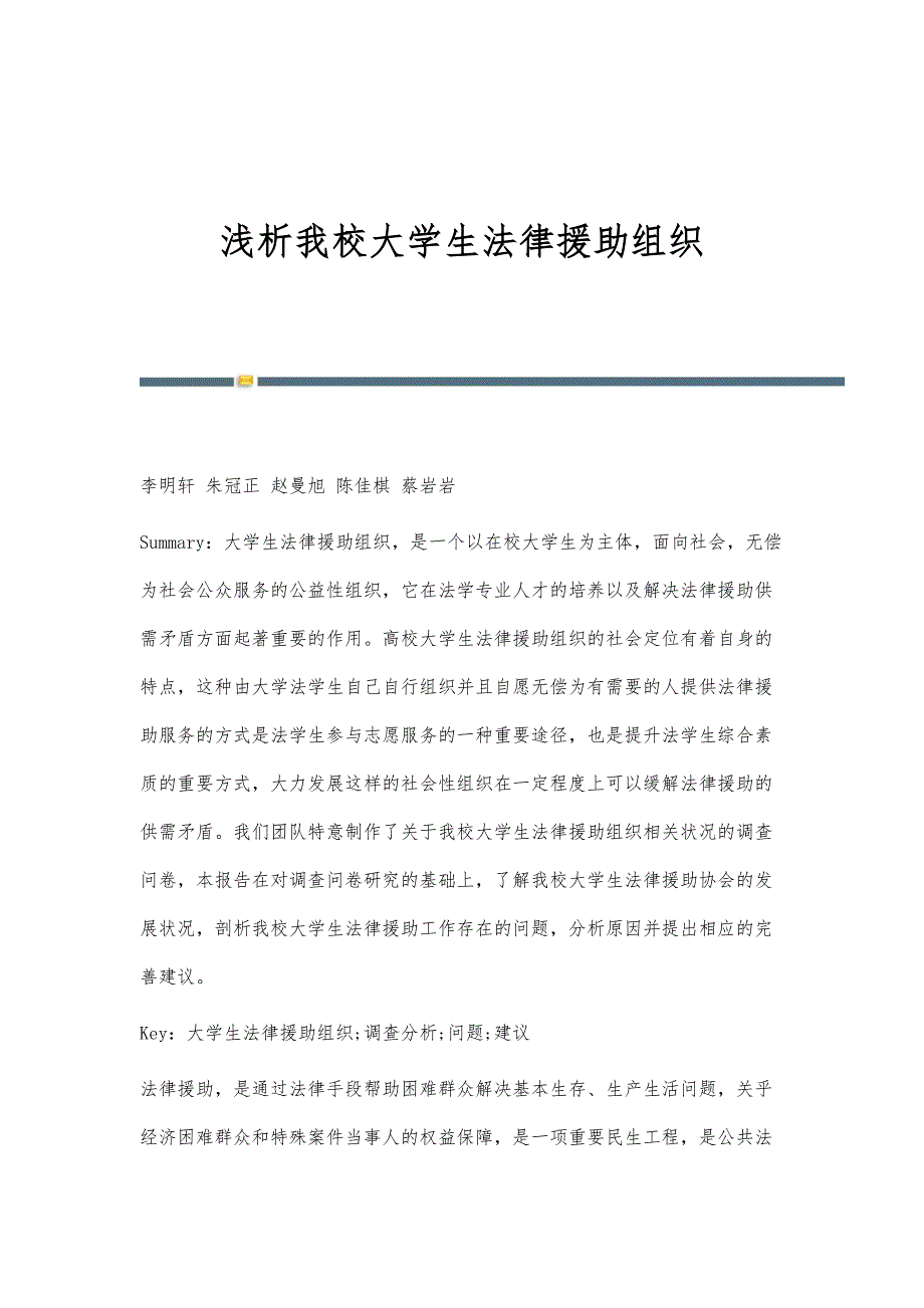 浅析我校大学生法律援助组织 李明轩 朱冠正 赵曼旭 陈佳棋 蔡岩岩Summary:大学生法律援助组织,是一个以在校大学生为主体,面向社会,无偿为社会公众服务的公益性组织,它在法学专业人才的培养以及解决法律援助供需矛盾方面起著重要的作用高校大学生法律援助组织的社会定位有着自身的特点,这种由大学法学生自己自行组织并且自愿无偿为有需要的人提供法律援助服务的方式是法学生参与志愿服务的一种重要途径,也是提升法学生综合素质的重要方式,大力发展这样的社会性组织在一定程度上可以缓解法律援助的供需矛盾我们团队特意制作了关于我校大学生法律援助组织相关状况的调查问卷,本报告在对调查问卷研究的基础上,了解我校大学生法律援助协会的发展状况,剖析我校大学生法律援助工作存在的问题,分析原因并提出相应的完善建议Key:大学生法律援助组织;调查分析;问题;建议法律援助,是通过法律手段帮助困难群众解决基本生存、生产生活问题,关乎经济困难群众和特殊案件当事人的权益保障,是一项重要民生工程,是公共法律服务体系的组成部分,是党和政府实施的阳光工程,是贯彻落实新时代中国特色社会主义思想的具体体现,是维护司法公正的有力屏障。