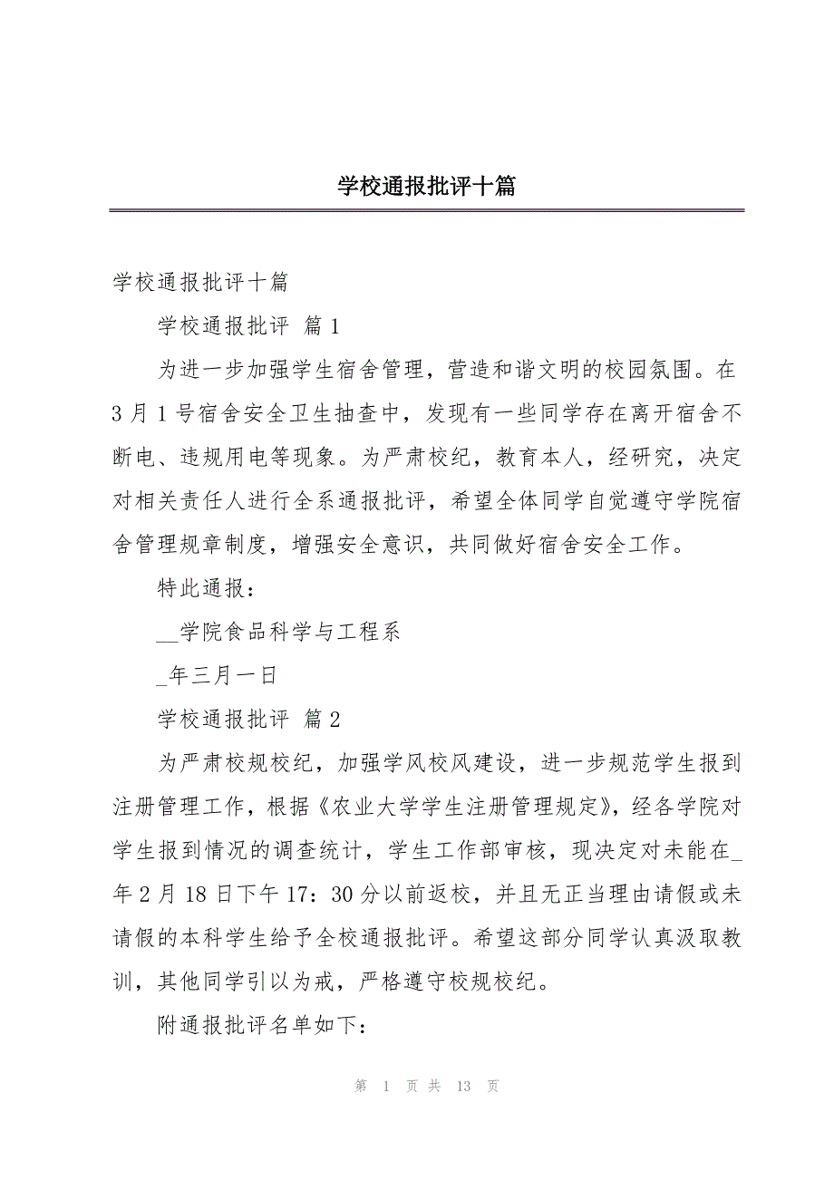 学校通报批评十篇学校通报批评十篇 学校通报批评 篇1 为进一步加强学生宿舍管理,营造和谐文明的校园氛围在3月1号宿舍安全卫生抽查中,发现有一些同学存在离开宿舍不断电、违规用电等现象为严肃校纪,教育本人,经研究,决定对相关责任人进行全系通报批评,希望全体同学自觉遵守学院宿舍管理规章制度,增强安全意识,共同做好宿舍安全工作 特此通报: __学院食品科学与工程系 _年三月一日 学校通报批评 篇2 为严肃校规校纪,加强学风校风建设,进一步规范学生报到注册管理工作,根据《农业大学学生注册管理规定》,经各学院对学生报到情况的调查统计,学生工作部审核,现决定对未能在_年2月18日下午17:30分以前返校,并且无正当理由请假或未请假的本科学生给予全校通报批评希望这部分同学认真汲取教训,其他同学引以为戒,严格遵守校规校纪 附通报批评名单如下: 水利与土木工程学院:(1人) 公共管理学院:(2人) 经济管理学院:(4人) 食品学院:(13人) 外国语学院:(2人) 艺术学院:(2人) 兽医学院:(3人) 学生工作部(处) _年2月28日 学校通报批评 篇3 院属_级、_级各班级: 为加强我院学风建设,保证我院学生课堂出勤率,创建优质课堂,我院开展了学风基础建设课堂考勤督查。