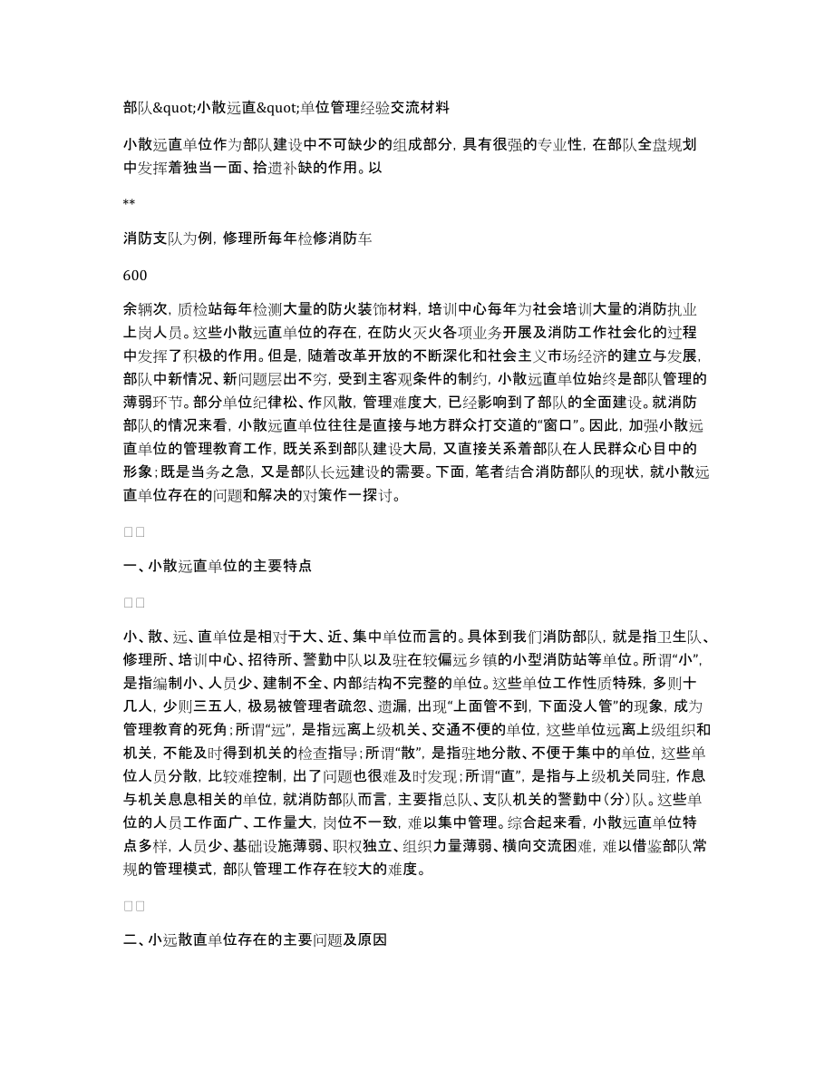 部队"小散远直"单位管理经验交流材料小散远直单位作为部队建设中不可缺少的组成部分,具有很强的专业性,在部队全盘规划中发挥着独当一面、拾遗补缺的作用以**消防支队为例,修理所每年检修消防车600余辆次,质检站每年检测大量的防火装饰材料,培训中心每年为社会培训大量的消防执业上岗人员这些小散远直单位的存在,在防火灭火各项业务开展及消防工作社会化的过程中发挥了积极的作用但是,随着改革开放的不断深化和社会主义市场经济的建立与发展,部队中新情况、新问题层出不穷,受到主客观条件的制约,小散远直单位始终是部队管理的薄弱环节部分单位纪律松、作风散,管理难度大,已经影响到了部队的全面建设就消防部队的情况来看,小散远直单位往往是直接与地方群众打交道的“窗口”因此,加强小散远直单位的管理教育工作,既关系到部队建设大局,又直接关系着部队在人民群众心目中的形象;既是当务之急,又是部队长远建设的需要下面,笔者结合消防部队的现状,就小散远直单位存在的问题和解决的对策作一探讨 一、小散远直单位的主要特点 小、散、远、直单位是相对于大、近、集中单位而言的具体到我们消防部队,就是指卫生队、修理所、培训中心、招待所、警勤中队以及驻在较偏远乡镇的小型消防站等单位。