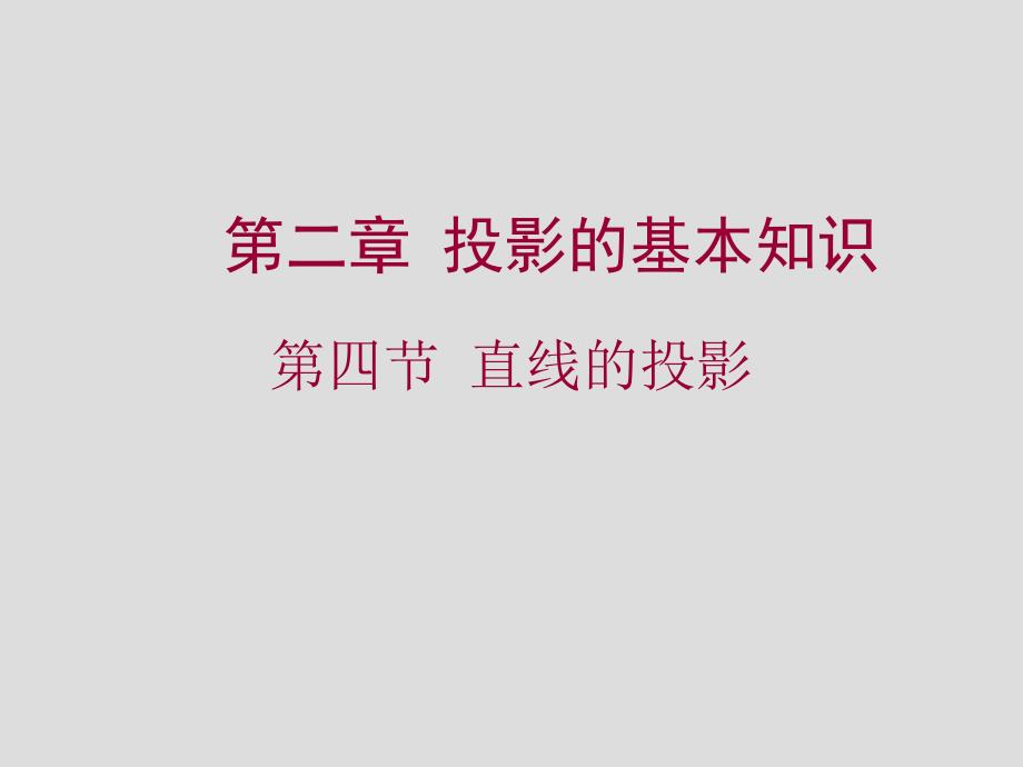 垂直线的投影特征:垂直线的投影特征:XOZYHYWb"a'aa"b'(b)例题 根据投影图判断下列直线的空间位置b"XOZYHYWa'aa"b'bXOZYHYWa'aa"b'bb"(b")XOZYHYWa'aa"b'b既然垂直线也平行于投影面,能否称它为平行线呢?讨论XOZYHYWb"a'aa"b'(b)b"XOZYHYWa'aa"b'bc'cd'd点在直线上,点的投影必在直线的同名投影上定比性:AC:CB=a 'c ':c 'b '=ac:cb=a"c" :c "b "四、直线上的点bXOa'ab'dDd'e'e1、 C点在直线AB上点在直线AB上点C在直线上AB上点C在直线上AB上 点点CC的的投投影影在在直直线线的的同同面面投投影影上上,,并并符符合合点点的投影规律的投影规律 C点在直线AB上点在直线AB上 2、D点不在、D点不在 直线AB上直线AB上NEW例题例题: : 在直线AB上找一点K,使AK:KB=3:2 bXOa'ab'32kk'例题例题: : 判定点K是否在直线AB上 k"OZYHYWa"b"k'kXa'ab'b例题例题: : 判定点K是否在直线AB上。