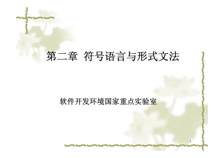 软件开发环境国家重点实验室1第二章 符号语言与形式文法第二章 符号语言与形式文法字母表、字符串及其集合符号语言及其运算性质形式文法及其派生语言形式文法的构成与等价形式文法的乔姆斯基体系定义 2.1 字母表是一个非空有限 集合,通常记作∑,其中元素称为字母表的字符3字母表及其字符特点: 1、字母表具有非空性和有穷性;2、字符具有不可分性 - 整体性;3、字符具有可区分性 - 可辨认性字母表与字符串例:考察以下字母表:∑ 1 = { aa, ab, bb }: 是字母表,其中, aa 不可拆分∑ 2 = { a, a‘, b, b’ }: 是字母表,其中, a, ‘ 不可拆分∑ 3 = { a, b, a }: 不是字母表,两个 a 无法区分字母表与字符串定义 2.2 设∑ 1,∑ 2 是两个字母表,∑ 1,∑ 2的乘积定义为∑ 1∑ 2 = { ab | a ∈∑ 1 ∧ b ∈∑ 2}例:1、 { 0, 1 } { a, b, c } = { 0a, 0b, 0c, 1a, 1b, 1c };2、 { a, b, c } { 0, 1 } = { a0, a1, b0, b1, 0c, c1 };3、 { aa, ab, bb } { 0, 1 } = { aa0, aa1, ab0, ab1, bb0, bb1 }显然,字母表的乘积不具有交换率。