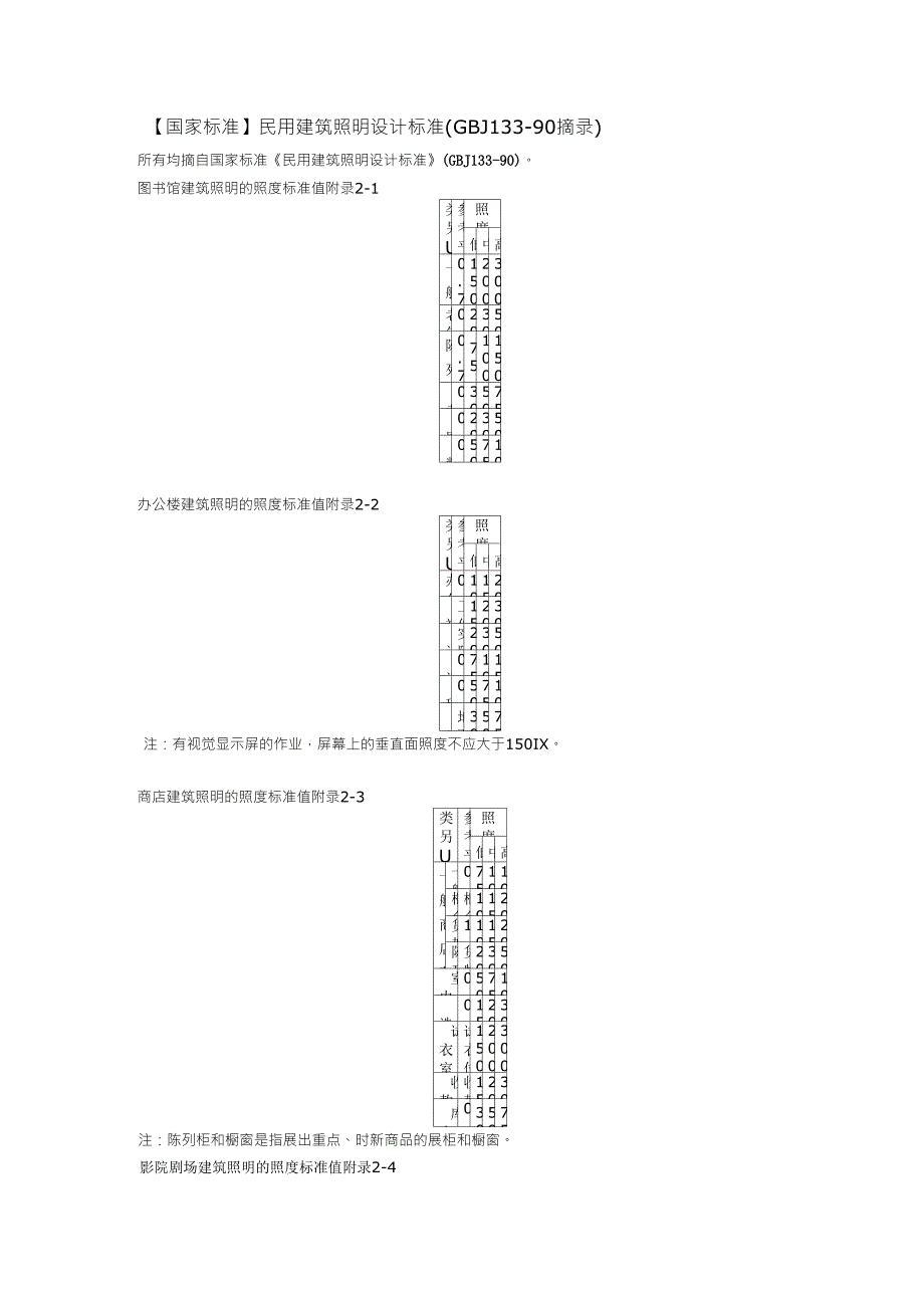 国家标准】民用建筑照明设计标准(GBJ133-90摘录)所有均摘自国家标准《民用建筑照明设计标准》(GBJ133-90)图书馆建筑照明的照度标准值附录2-1类另U参考平面及其高度照度标准值(lx)低中高一般阅览室、少年儿童阅览室、研究室、装裱修理间、美工室0.75m水平面150200300老年读者阅览室、善本室和舆图阅览室0.75m水平面200300500陈列室、目录厅(室)、出纳厅(室)、视听室、缩微阅览室0.75m水平面75100150读者休息室0.75m水平面305075书库0.75m水平面203050开敞式运输传送设备0.75m水平面5075100办公楼建筑照明的照度标准值附录2-2类另U参考平面及其高度照度标准值(lx)低中高办公室、报告厅、会议室、接待室、陈列室、营业厅0.75m水平面100150200有视觉显示屏的作业工作台水平面150200300设计室、绘图室、打字室实际工作面200300500装订、复印、晒图、档案室0.75m水平面75100150值班室0.75m水平面5075100门厅地面305075注:有视觉显示屏的作业,屏幕上的垂直面照度不应大于150IX商店建筑照明的照度标准值附录2-3类另U参考平面及其高度照度标准值(lx)低中高一般商店营业厅一般区域0.75m水平面75100100柜台柜台面上100150200货架1.5m垂直面100150200陈列柜、橱窗货物所处平面200300500室内菜市场营业厅0.75m水平面5075100自选商场营业厅0.75m水平面150200300试衣室试衣位置1.5m高处垂直面150200300收款处收款台面150200300库房0.75m水平面305075注:陈列柜和橱窗是指展出重点、时新商品的展柜和橱窗。