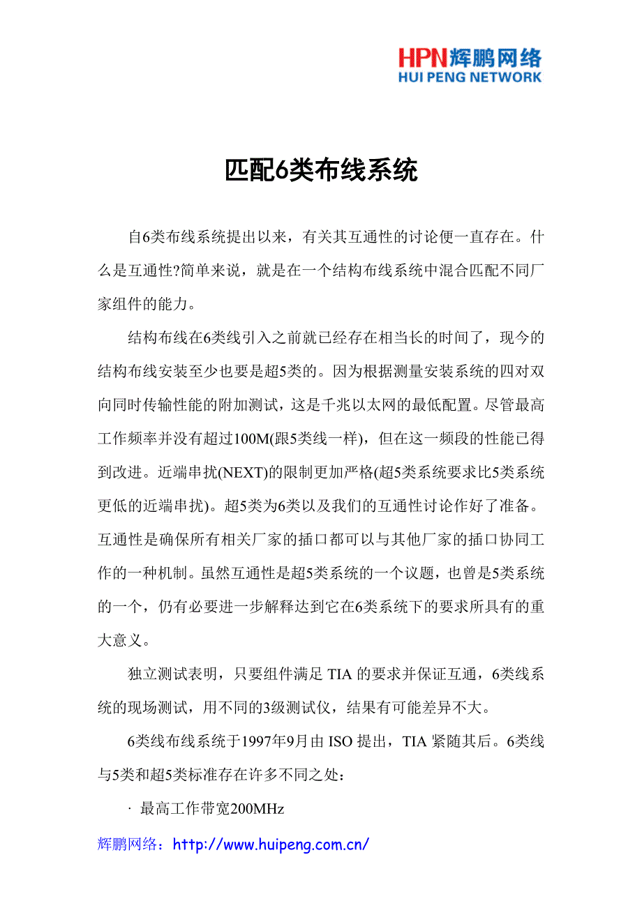 匹配6类布线系统 自6类布线系统提出以来,有关其互通性的讨论便一直存在什么是互通性?简单来说,就是在一个结构布线系统中混合匹配不同厂家组件的能力 结构布线在6类线引入之前就已经存在相当长的时间了,现今的结构布线安装至少也要是超5类的因为根据测量安装系统的四对双向同时传输性能的附加测试,这是千兆以太网的最低配置尽管最高工作频率并没有超过100M(跟5类线一样),但在这一频段的性能已得到改进近端串扰(NEXT)的限制更加严格(超5类系统要求比5类系统更低的近端串扰)超5类为6类以及我们的互通性讨论作好了准备互通性是确保所有相关厂家的插口都可以与其他厂家的插口协同工作的一种机制虽然互通性是超5类系统的一个议题,也曾是5类系统的一个,仍有必要进一步解释达到它在6类系统下的要求所具有的重大意义 独立测试表明,只要组件满足TIA的要求并保证互通,6类线系统的现场测试,用不同的3级测试仪,结果有可能差异不大 6类线布线系统于1997年9月由ISO提出,TIA紧随其后6类线与5类和超5类标准存在许多不同之处: · 最高工作带宽200MHz · 按照250MHz下检测进行设计 · 可作为UTP和STP的解决方案 · 包括超5类的所有测试,并加入新的参量 · ISO定义6类线永久链路与信道为Class E 早期6类线的发展走的是与5类和超5类很类似的道路。