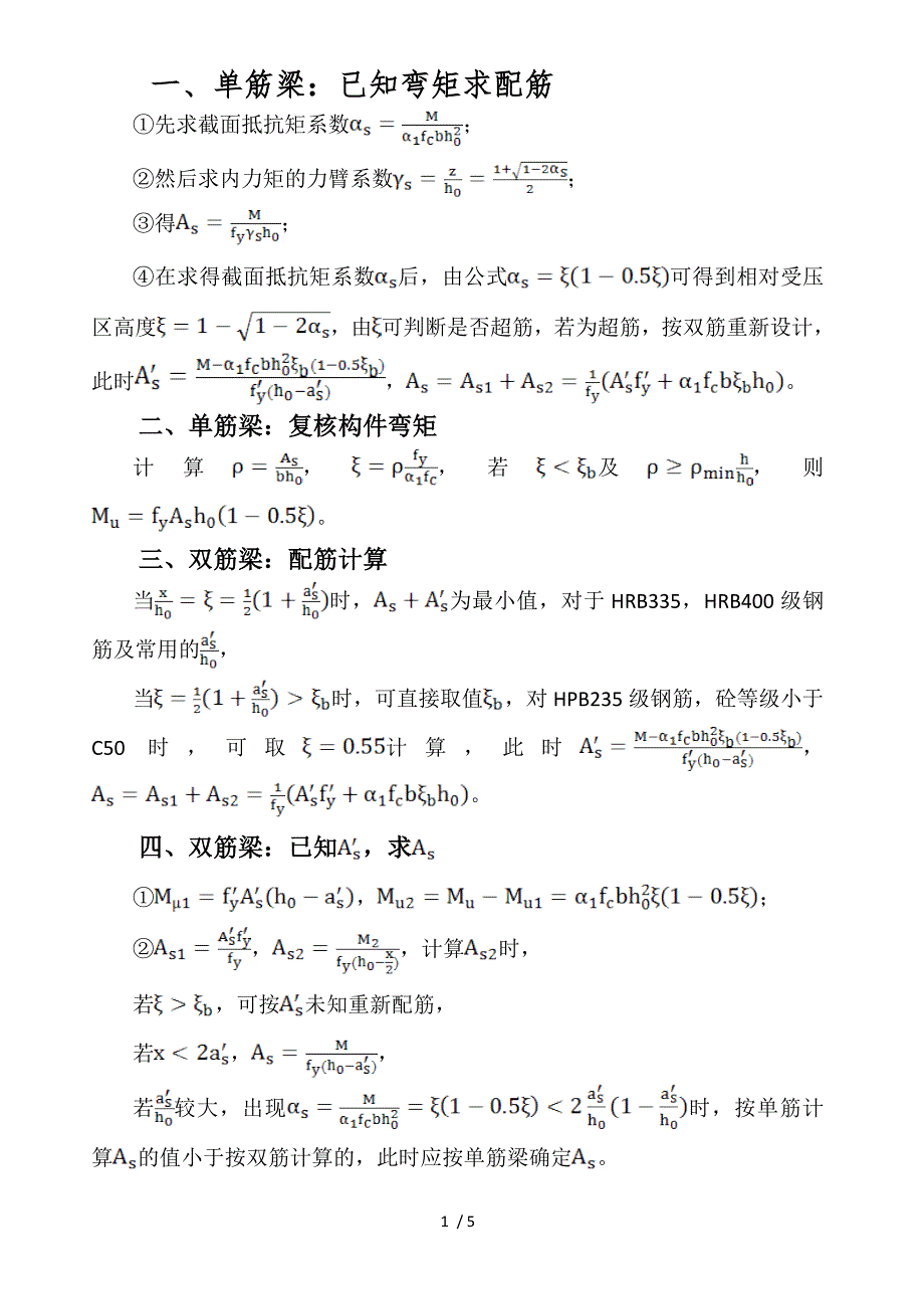 一、单筋梁:已知弯矩求配筋①先求截面抵抗矩系数;②然后求内力矩的力臂系数;③得;④在求得截面抵抗矩系数后,由公式可得到相对受压区高度,由可判断是否超筋,若为超筋,按双筋重新设计,此时,二、单筋梁:复核构件弯矩计算,,若及,则三、双筋梁:配筋计算当时,为最小值,对于HRB335,HRB400级钢筋及常用的,当时,可直接取值,对HPB235级钢筋,砼等级小于C50时,可取计算,此时,四、双筋梁:已知,求①,;②,,计算时,若,可按未知重新配筋,若,,若较大,出现时,按单筋计算的值小于按双筋计算的,此时应按单筋梁确定五、偏心受压:对称配筋计算,已知 ,N,M,砼标号,钢筋级别,求 注意此时不能用M代入力矩平衡公式计算,须由M求,求,得e后用Ne代入力矩平衡方程应按以下步骤进行①由公式求出x,与值比较,若,按大偏心计算配筋,反之按小偏心计算配筋②按大偏心计算时,取,由求得,再判断是否符合最小配筋率要求并验算短边方向轴心受压的稳定③按小偏心计算时,,由此求得,此处是砼结构设计基本假定中的矩形受压区高度与中和轴高度的比值,C50及以下,C80时,C50~C80内插④以上求时公式中的e是轴向力作用点至受拉钢筋合力点之间的距离,需考虑初始偏心距和二阶弯矩偏心距增大系数,可由下列公式求出:是附加偏心距,其值取偏心方向截面尺寸的和20mm中的较大值;是柱的计算长度;是偏心受压构件截面曲率修正系数,时取1,中的A对T形、形截面均取;是偏心受压构件长细比对截面曲率的影响系数,当时,,当时,。