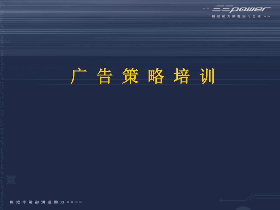 广广 告告 策策 略略 培培 训训 广告策略肩负三大使命互作界定 协作各部门工作的准则提供资讯 市场竞争资料分析和结论品质管制 出台作品的正确性与优秀性的衡量推动广告作业的基本问题1、Why to say 广告目的(EX 建立知名度,改变态度)2、How much to say 广告预算3、Whom to say 目标视听众4、What to say 产品实质 利益 心理 利益 品牌特性(Brand Character)5、How to say 创意表现(如何说怎么说)6、When & Where to say 媒体策略、配合的促销和公关策略广告策略的定义是什么?广告策略是将产品和服务所有的购买者利益,以有效的方法与步骤,传达给目标市场,以促进销售的最高指导原则广告策略的目的?解决哪些问题?广告策略的制定是建立在行销策略架构下,其目的乃在配合行销策略,将产品与公司形象和品牌作正确的整合,并透过传播管道,针对目标市场作有效沟通有效的广告策略应包含哪些要素?对公司的行销策略应有非常清楚的描述与认知。