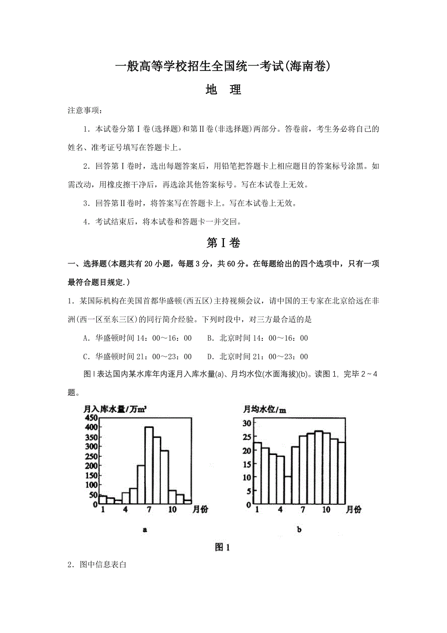 一般高等学校招生全国统一考试(海南卷)地 理注意事项: 1.本试卷分第Ⅰ卷(选择题)和第Ⅱ卷(非选择题)两部分答卷前,考生务必将自己的姓名、准考证号填写在答题卡上 2.回答第Ⅰ卷时,选出每题答案后,用铅笔把答题卡上相应题目的答案标号涂黑如需改动,用橡皮擦干净后,再选涂其他答案标号写在本试卷上无效 3.回答第Ⅱ卷时,将答案写在答题卡上写在本试卷上无效 4.考试结束后,将本试卷和答题卡一并交回第Ⅰ卷一、选择题(本题共有20小题,每题3分,共60分在每题给出的四个选项中, 只有一项最符合题目规定.)1.某国际机构在美国首都华盛顿(西五区)主持视频会议,请中国的王专家在北京给远在非洲(西一区至东三区)的同行简介经验下列时段中,对三方最合适的是 A.华盛顿时间14:00~16:00 B.北京时间14:00~16:00C.华盛顿时间2l:00~23:00 D.北京时间21:00~23:00图l表达国内某水库年内逐月入库水量(a)、月均水位(水面海拔)(b)读图1,完毕2~4题2.图中信息表白 A.1~7月流域降水量持续增长 B.夏秋季节水库水位随入库水量的减少而减少 C.冬春季节水库入库水量少于出库水量 D.6~12月水库水位随流域降水量的增多而升高3.对5月份水库浮现最低水位的合理解释是 A.降水量少 B.入库水量少 C.蒸发量大 D.为防洪放水腾出库容4.该水库也许位于 A.太行山地 B.秦岭山地C.江苏省北部 D.云南省中部某跨国公司在中国某市投资建设自动化的食用油生产厂,用国际市场上的大豆为原料,生产食用油。